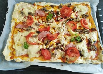 W ciepłej wodzie rozpuszczamy cukier i drożdże, zostawiamy na 15 minut do wyrośnięcia. Do wyrośniętych drożdży dodajemy mąką i oliwę, wyrabiamy ciasto. Wyrobione ciasto odstawiamy w ciepłe miejsce na około 30 minut, żeby wyrosło. W tym czasie możemy zająć się przygotowaniem sosu. Cebulę kroimy w drobną kostkę i przesmażamy na maśle lub oliwie z oliwek. Dodajemy passatę oraz koncentrat pomidorowy i na małym ogniu odparowujemy większość wody. Dodajemy przyprawy, mieszamy i odstawiamy do przestudzenia. Wyrośnięte ciasto dzielimy na dwie części, rozwałkowujemy podsypując w razie potrzeby mąką i przekładamy na blaszkę wyłożoną papierem do pieczenia. Smarujemy przestudzonym sosem pomidorowym. Pieczemy 15 minut w piekarniku nastawionym na 180 stopni, po tym czasie wyciągamy, dokładamy dowolne składniki i pieczemy kolejne 15-20 minut.