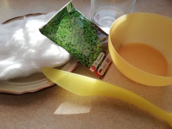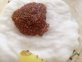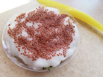 Aby wygodnie i równomiernie rozprowadzić ziarna na watce/ręczniku po prostu wylej zawartość miseczki na spodek. A teraz przy użyciu swoich palców lub plastikowego nożyka rozsmaruj je (podobnie jak masło na kanapce) po całej powierzchni waty.