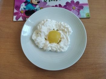 3. Zrób  „jajko sadzone” z połówki moreli z puszki i bitej śmietany.