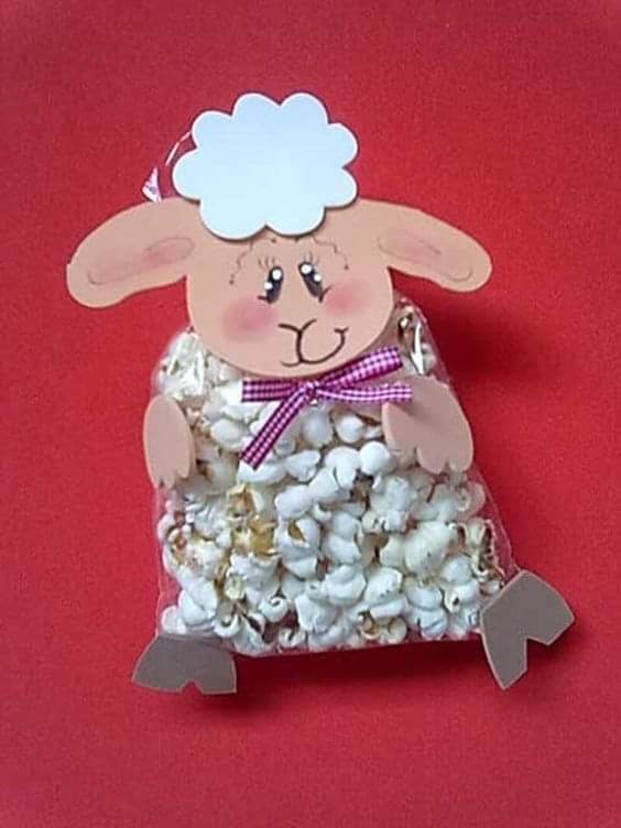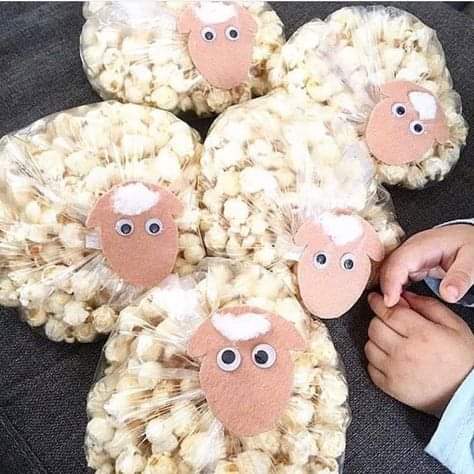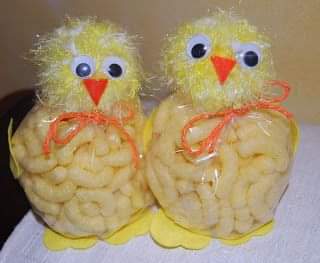 Druga propozycja to wielkanocne zwierzątka z woreczków foliowych i przekąsek ( mogą być chrupki albo popcorn). Wystarczy nasypać przekąski do woreczków i zawiązać...A potem przykleić narysowane głowy i nogi ( baranka, owcy lub kurczaka).