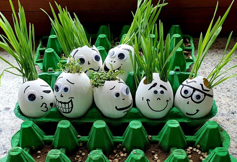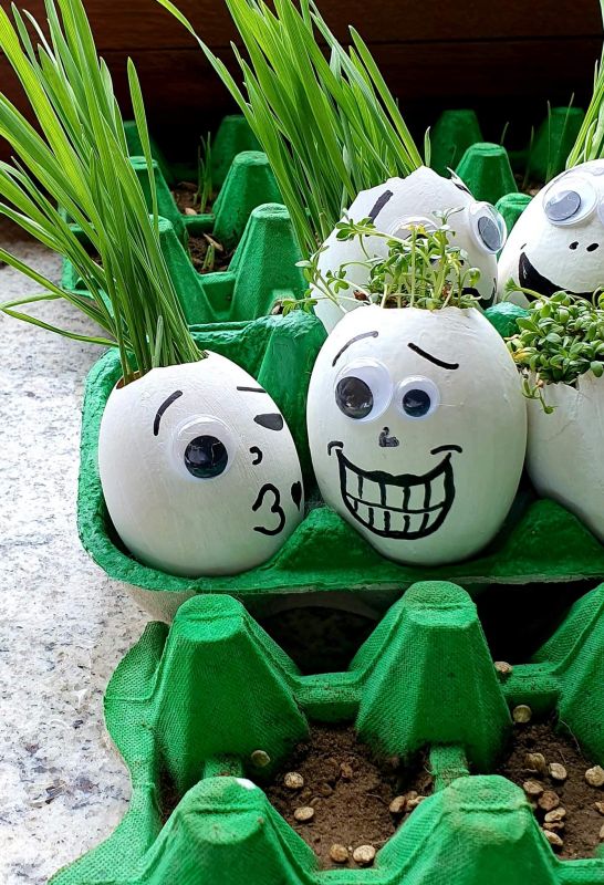 Wytłoczkę pomalujemy na zielono (bo przecież to kolor wiosny). Do skorupek (pamiętajcie jak mama robi jajecznicę..nie wyrzucajcie ich..można zrobić ciekawe rzecz) wsadzamy trochę ziemi lub waty. Wysiewamy nasiona. Teraz pozostało nam narysować na skorupkach śmieszne buźki (oczy, nos i oczywiście uśmiechy). Na pewno macie mnóstwo ciekawych pomysłów. 🐣