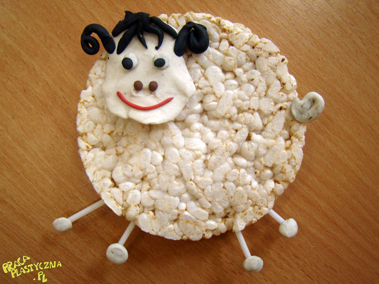 W ryżowy krążek wbijamy cztery patyczki – to są nogi.  Białą plastelinę formujemy w koło i przyklejamy na nim szczegóły pyszczka (rogi, grzywkę, oczy, nosek i buźkę). Głowę baranka przyklejamy  w górnej części krążka ryżowego, doklejamy ogonek i baranek gotowy.