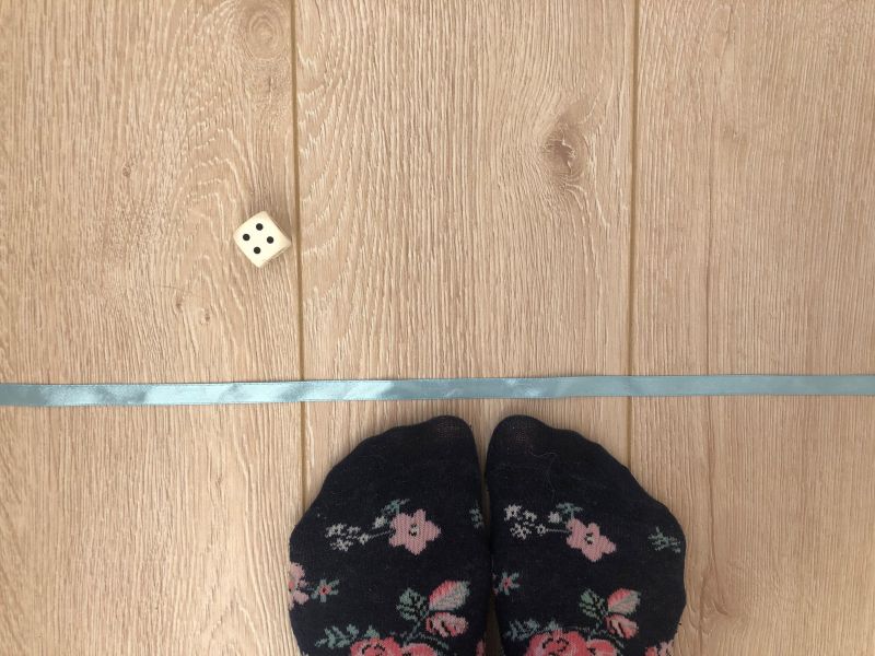 Następnie ustawcie się przy pierwszej linii. Każdy z zawodników rzuca kostką i skacze tyle razy, ile oczek wyrzucił. Powtarzamy to aż ktoś przekroczy linię mety! Prawda, że proste?