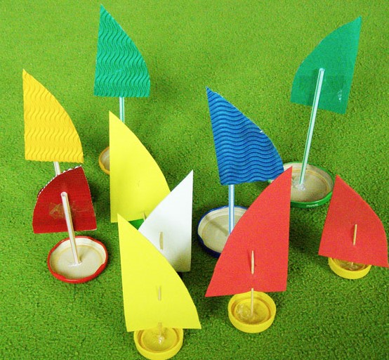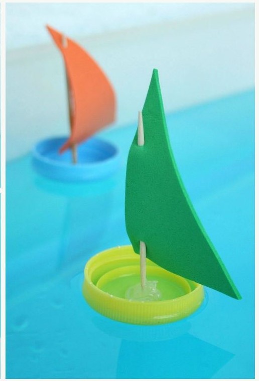 Wykonanie żaglówek jest bardzo proste. Z tekturki lub pianki należy wyciąć trójkąty, które będą służyć za żagle. Następnie należy przebić je wykałaczkami w dwóch miejscach, tak żeby żagiel trzymał się na patyczku. Końcówkę wykałaczki przyklejcie do środka plastikowej zakrętki. Możecie użyć do tego kleju na gorąco lub kawałek plasteliny. Żaglówki gotowe!