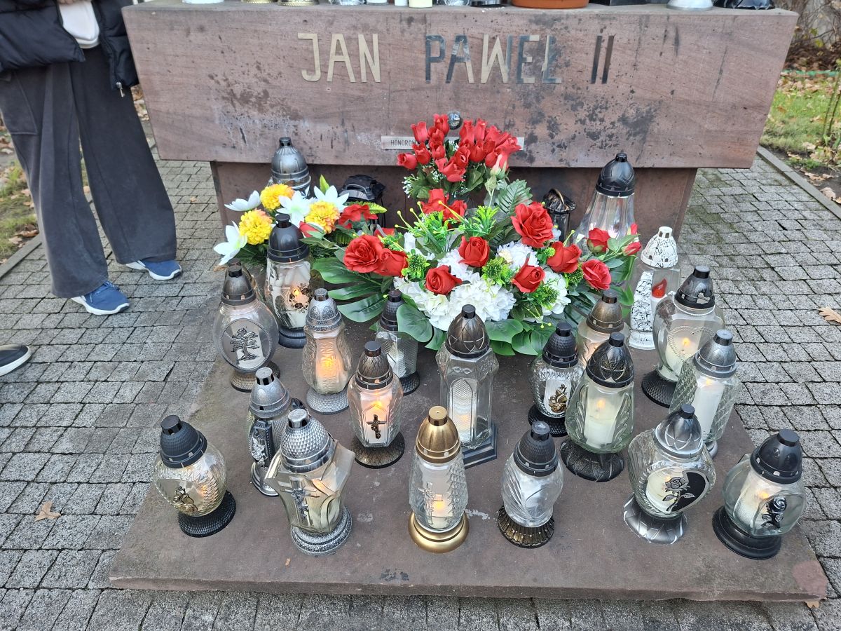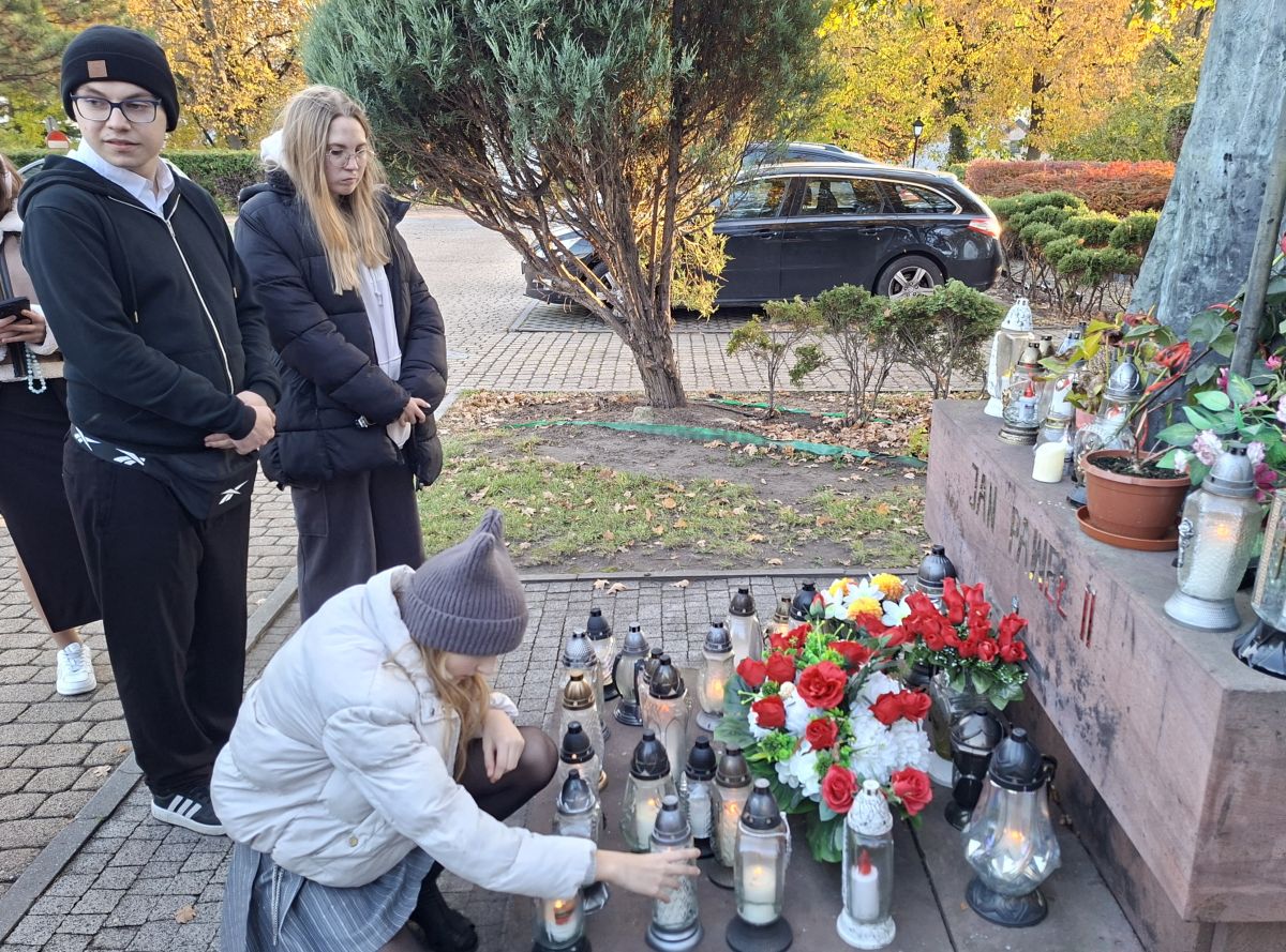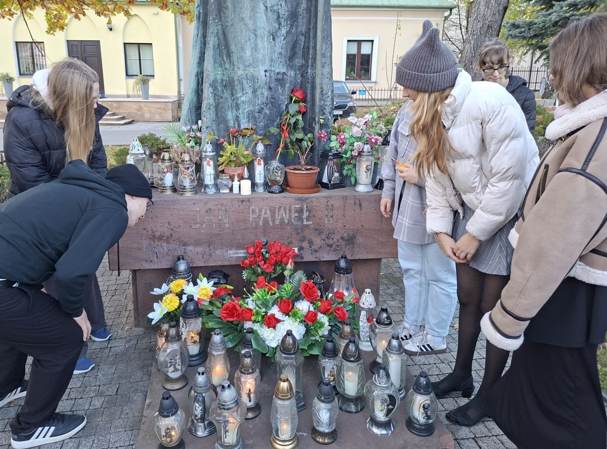 W czwartkowe  popołudnie  grupy wychowawcze zapaliły znicz  pod pomnikiem św.  Jana Pawła II na okoliczność 47. Rocznicy Wyboru Polaka  na Papieża . Oddaliśmy hołd wielkiemu  Polakowi, który zasłużył się dla Polski i całego Świata. Karol Wojtyła został wybrany papieżem  16 października 1978 roku podcza konlawe  czyli zgromadzenia kardynałów, którzy wybierają nowego papieża, odbywające się w całkowitej izolacji od świata zewnętrznego. Był 264 w historii papieżem. Jego pontyfikat trwał dokładnie 26 lat 5 miesięcy i 16 dni. Według oficjalnych dokumentów watykańskich w okresie swojego pontyfikatu Ojciec Święty Jan Paweł II odbył w sumie 104 pielgrzymki zagraniczne, odwiedzając ponad 130 krajów i około 900 miejscowości. Jan Paweł II został pochowany w Watykanie na terenie Bazyliki św. Piotra  w kaplicy św. Sebastiana. Beatyfikowany przez papieża Benedykta XVI – 1 maja 2011 roku. Natomiast Papież Franciszek ogłosił go świętym 27 kwietnia 2014 roku. Odwiedziliśmy również pomnik bł.ks.Jerzego Popiełuszko- polskiego duchownego rzymskokatolickiego, tercjarza franciszkańskiego, kapelana warszawskiej „Solidarności”, obrońcy praw człowieka w PRL. Zamordowanego 41 lat temu(19.10.1984r) przez funkcjonariuszy Służby Bezpieczeństwa. Błogosławiony i męczennik Kościoła katolickiego. Pośmiertnie odznaczony Orderem Orła Białego. Zapaliliśmy przy pomnikach "ZNICZE PAMIĘCI".