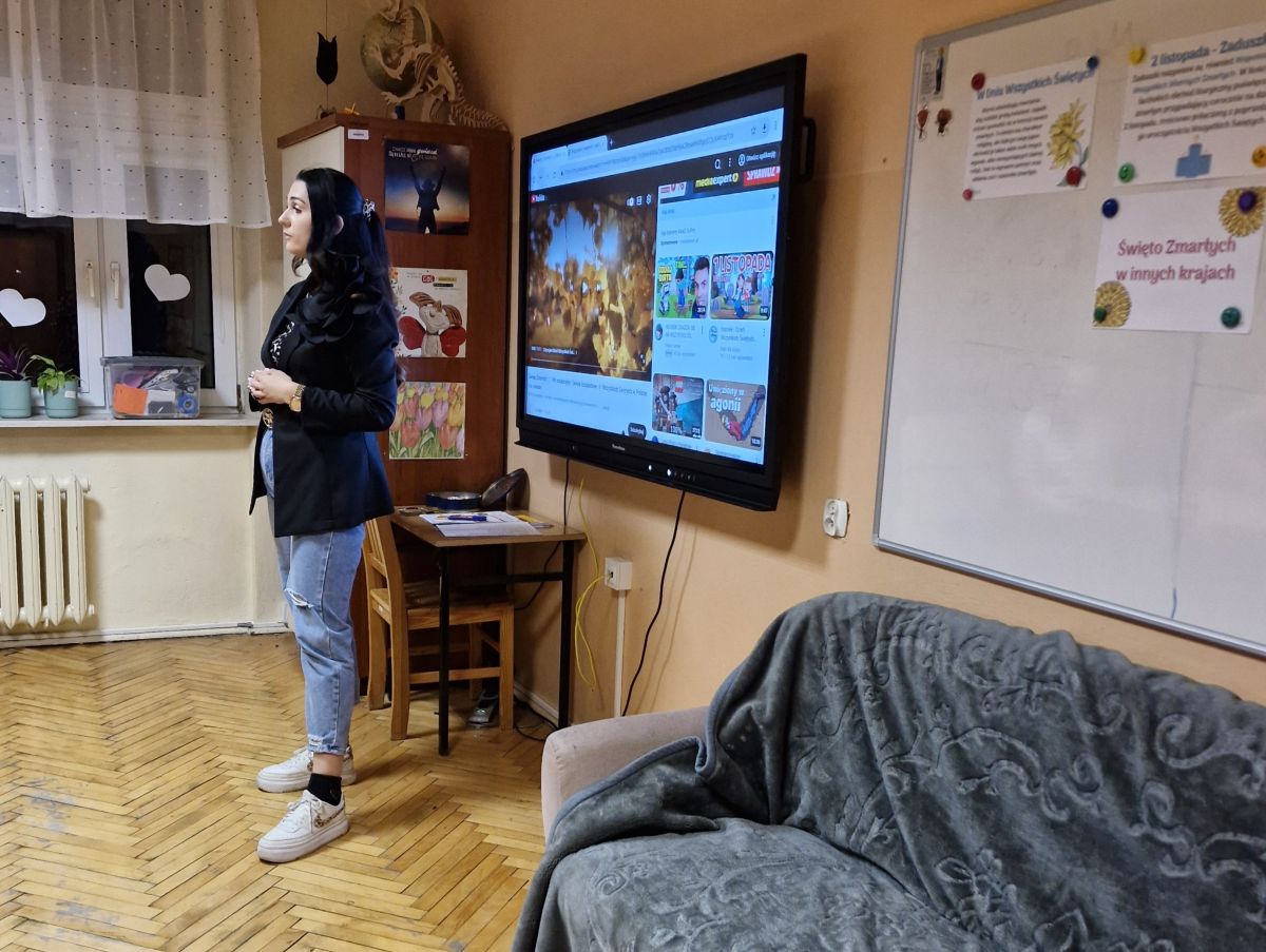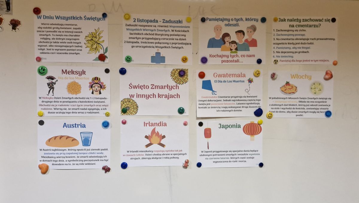 Wychowankowie grup wychowawczych mieli okazję dowiedzieć się więcej o tej uroczystości w ramach zajęć edukacyjnych prowadzonych przez wychowawcę. Obejrzeli film edukacyjny, na podstawie którego dowiedzieli się jak świętuje się Wszystkich Świętych w Polsce oraz na świecie, przypomnieli sobie zasady obowiązujące na cmentarzu, pisali wspomnienia o swoich bliskich Zmarłych oraz wykonywali ćwiczenia tematyczne na platformie internetowej Wordwall, doskonaląc przy tym umiejętność korzystania z tablicy multimedialnej.