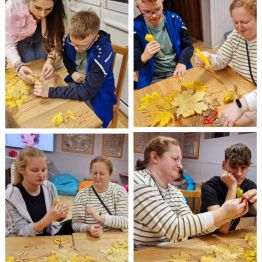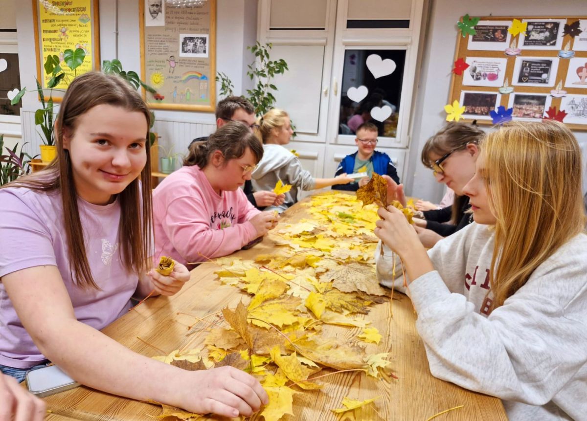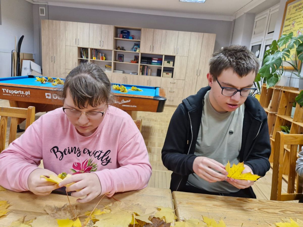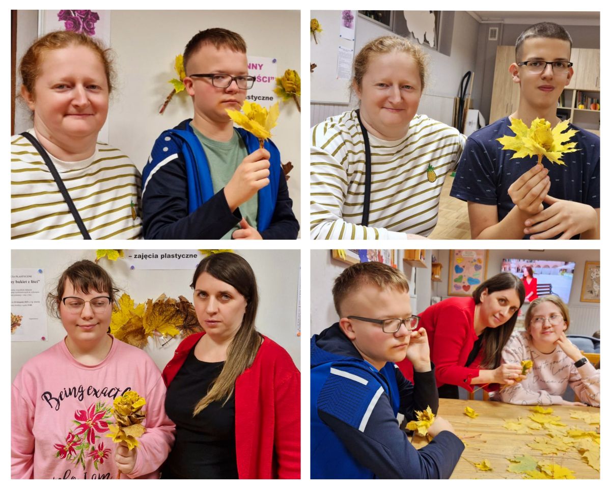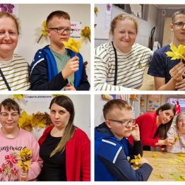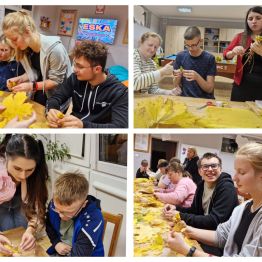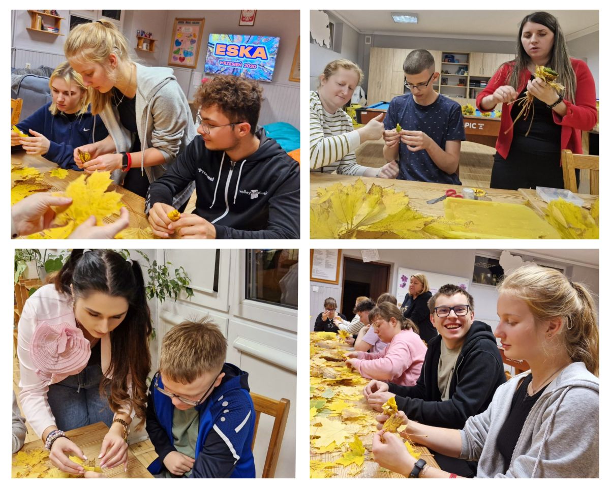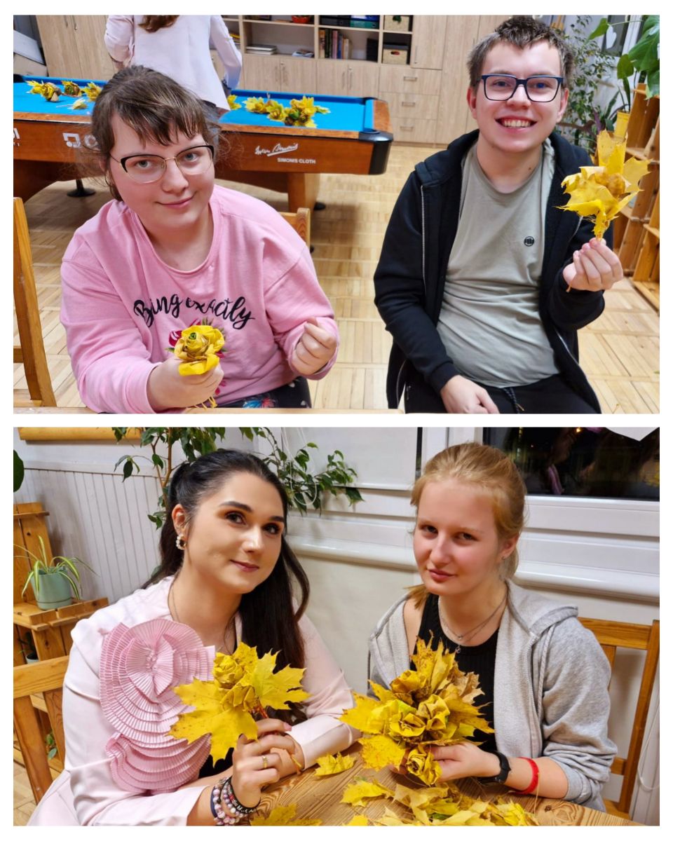 Na tą okoliczność we wtorek popołudniu na zajęciach plastycznych, zintegrowani wychowankowie różnych grup wychowawczych wykonywali własnoręcznie prace plastyczne - bukiet z liści.
