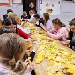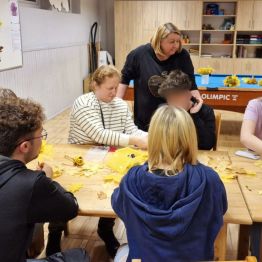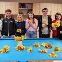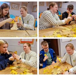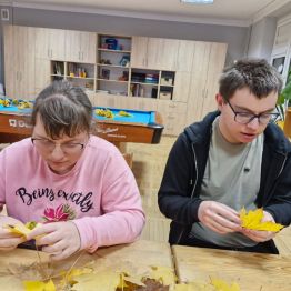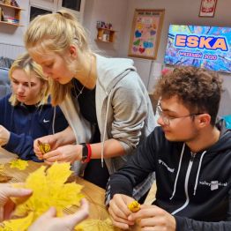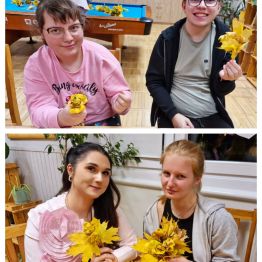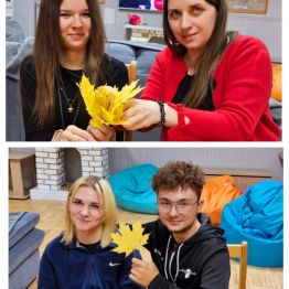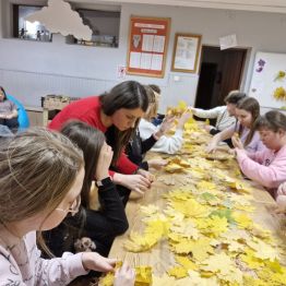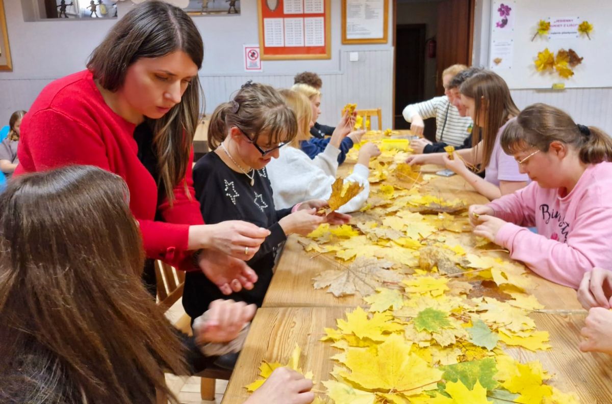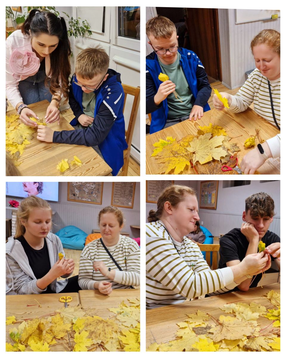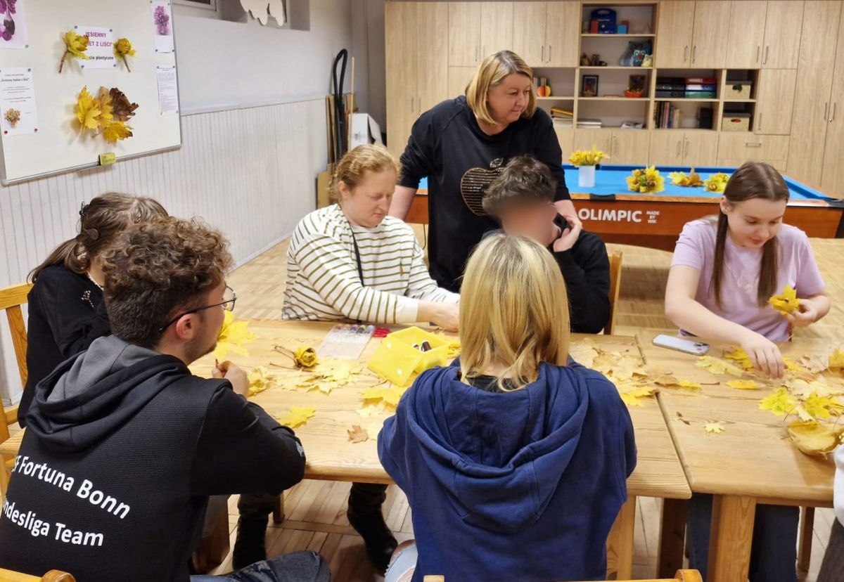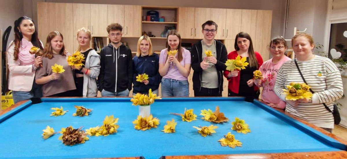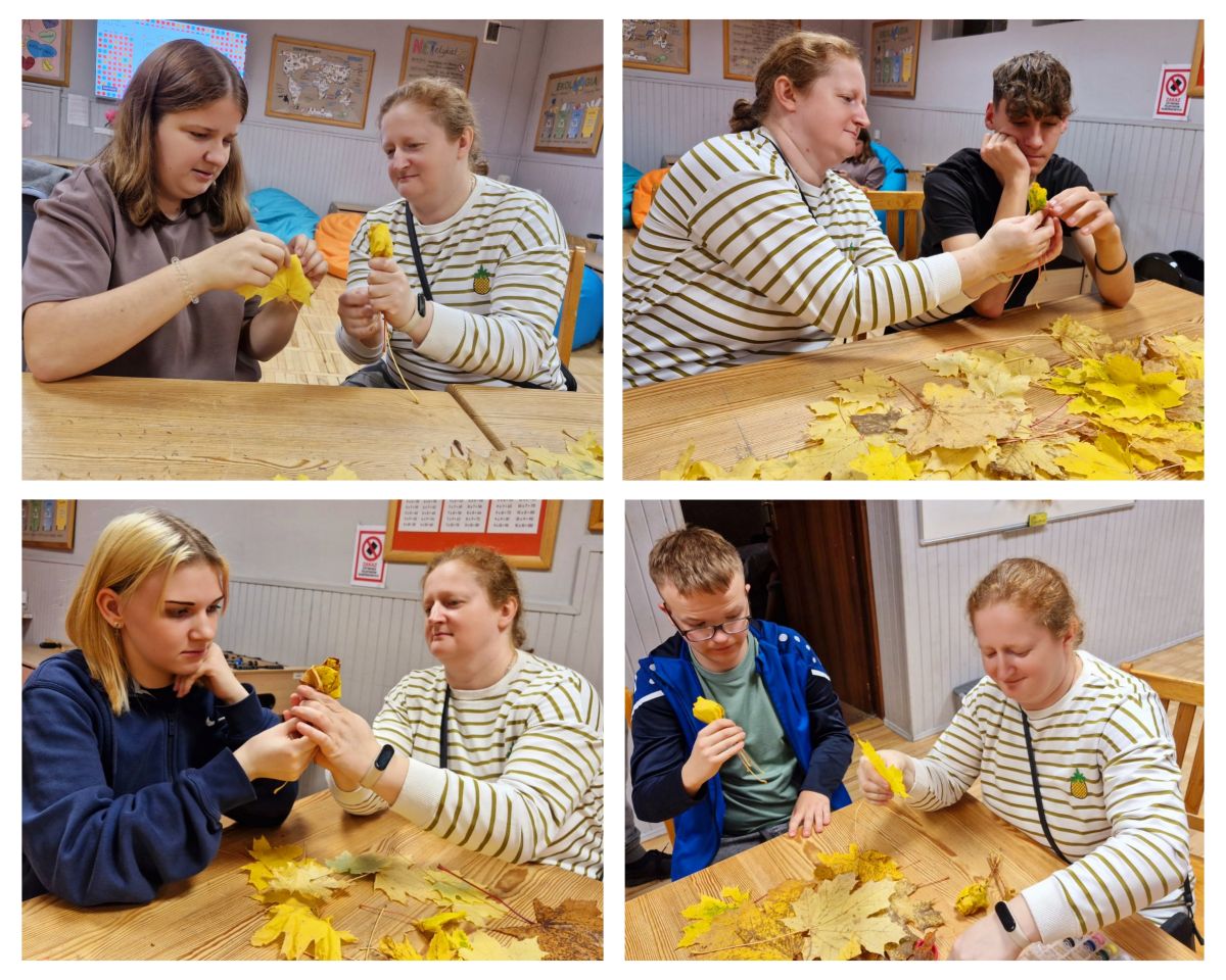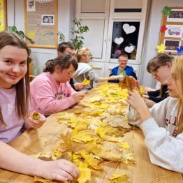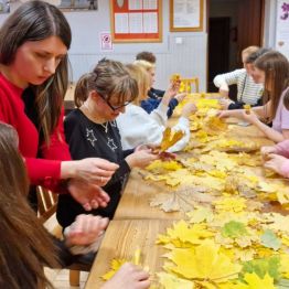 Na tą okoliczność we wtorek popołudniu na zajęciach plastycznych, zintegrowani wychowankowie różnych grup wychowawczych wykonywali własnoręcznie prace plastyczne - bukiet z liści.