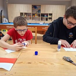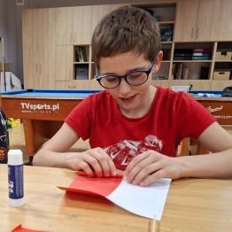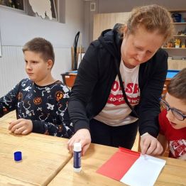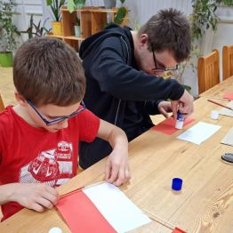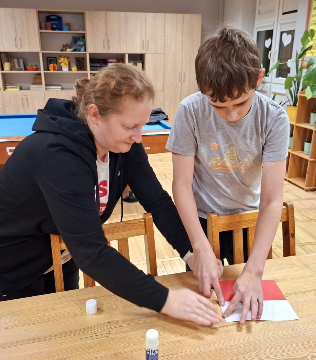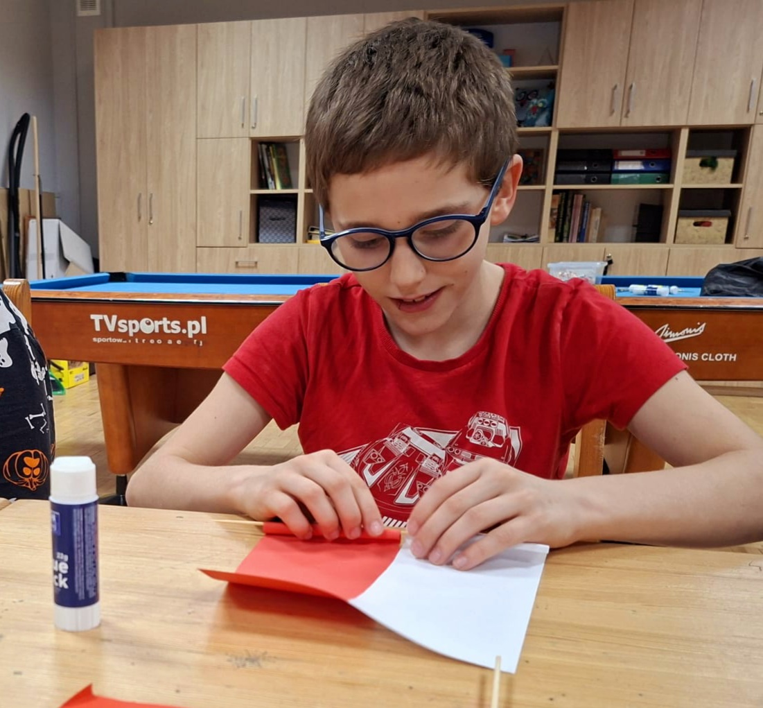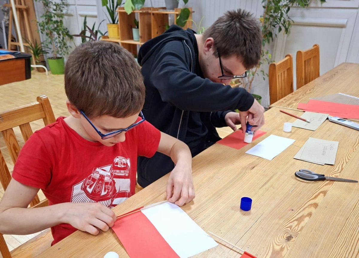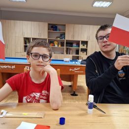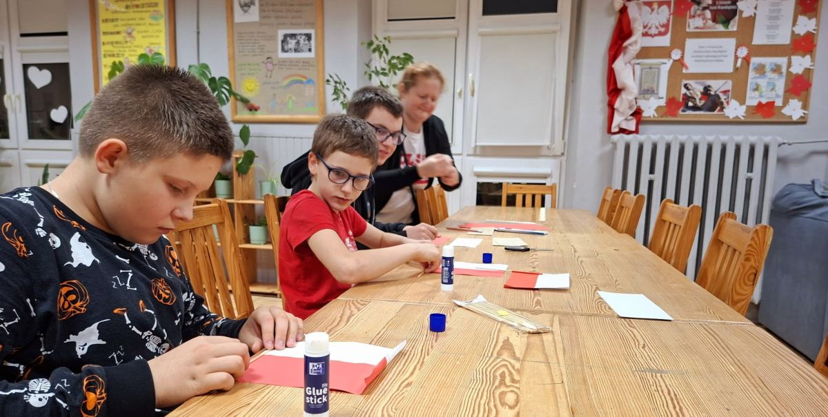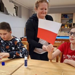 Duch patriotyzmu można zaszczepić między innymi poprzez działania plastyczne, takie jak tworzenie flagi, godła oraz kotylionów. W miłej i twórczej atmosferze nasi wychowankowie mieli okazję doskonalić swoją kreatywność. Powstały piękne flagi. Wspólna praca wywołała dyskusję na temat poczucia tożsamości narodowej, zintegrowała grupy oraz przyczyniła się do rozwijania sprawności manualnej, dokładności i estetyki. Cieszymy się, że "Biało-Czerwona" zagościła w naszych pokojach.