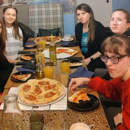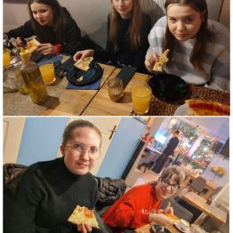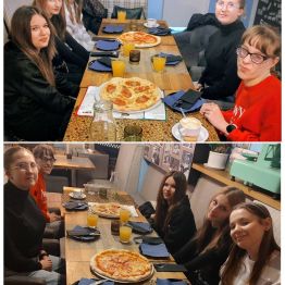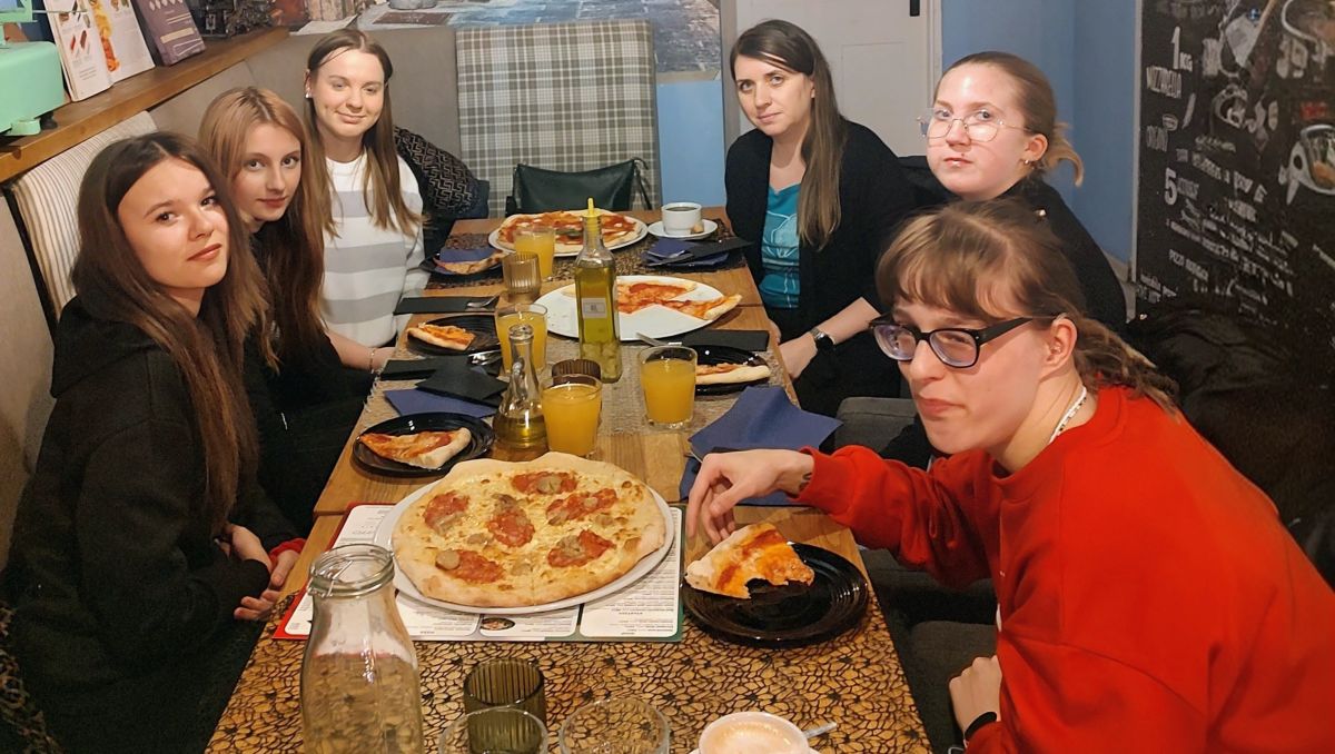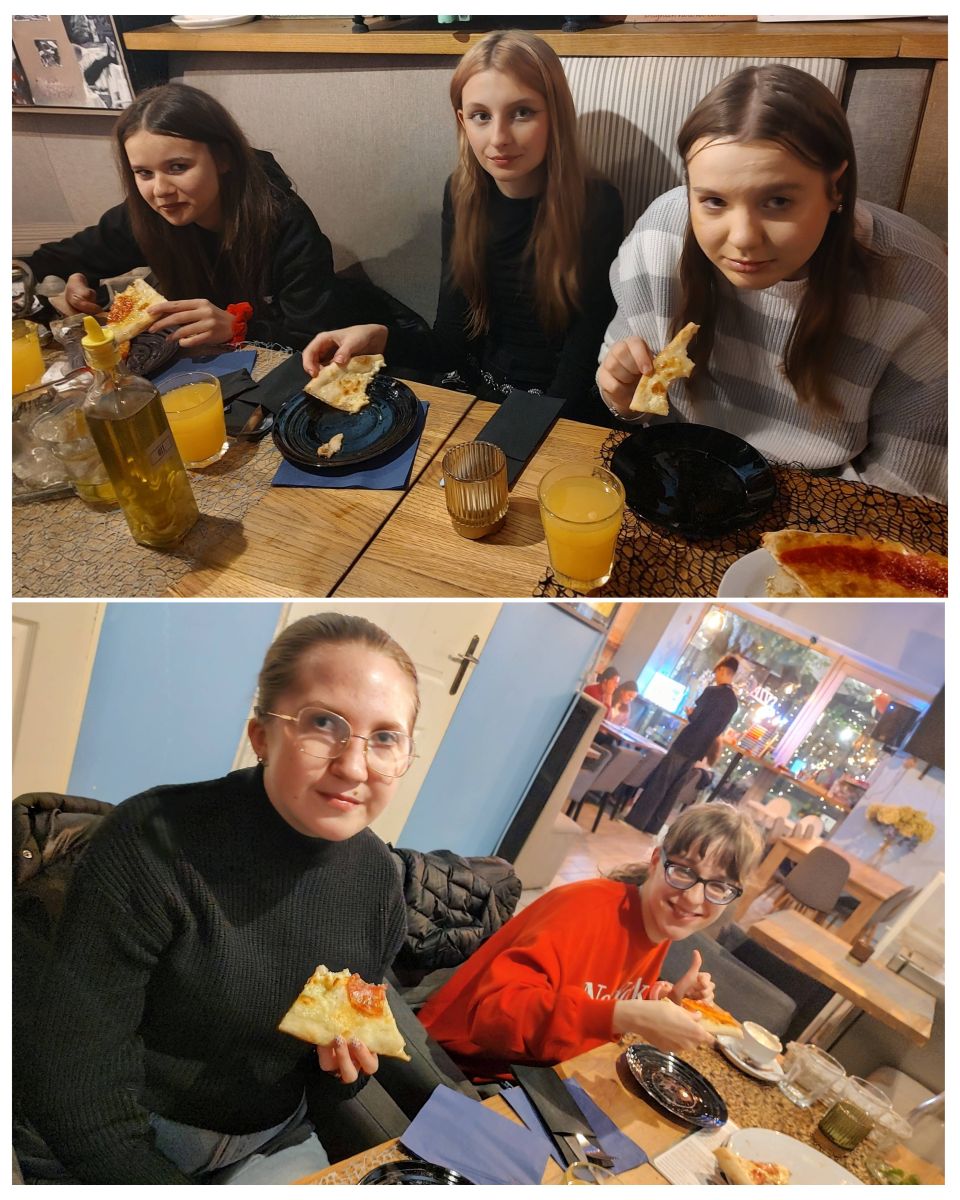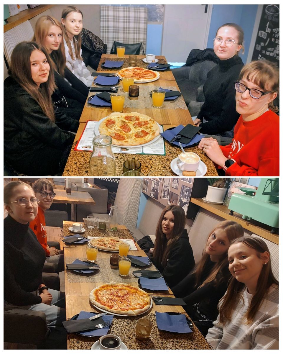 Z tej okazji koleżanki z grupy odśpiewały Magdzie gromkie „Sto lat” i złożyły serdeczne życzenia, następnie jubilatka otrzymała symboliczne prezenty. Życzeniem jubilatki było wyjście wraz z koleżankami z grupy do włoskiej restauracji „Azzurro” znajdującej się na ul. Sienkiewicza 60A, aby tam uczcić jej 15–ste urodziny, gdzie zamiast tortu była pizza. Jak było widać jedzenie wszystkim bardzo smakowało. Nie zabrakło swobodnych rozmów i żartów, bo przecież „Urodziny” to właśnie święto uśmiechu i zabawy. Dzień spędziliśmy bardzo przyjemnie, a na twarzy Solenizantki widać było szczęście, radość i ogromne zadowolenie.