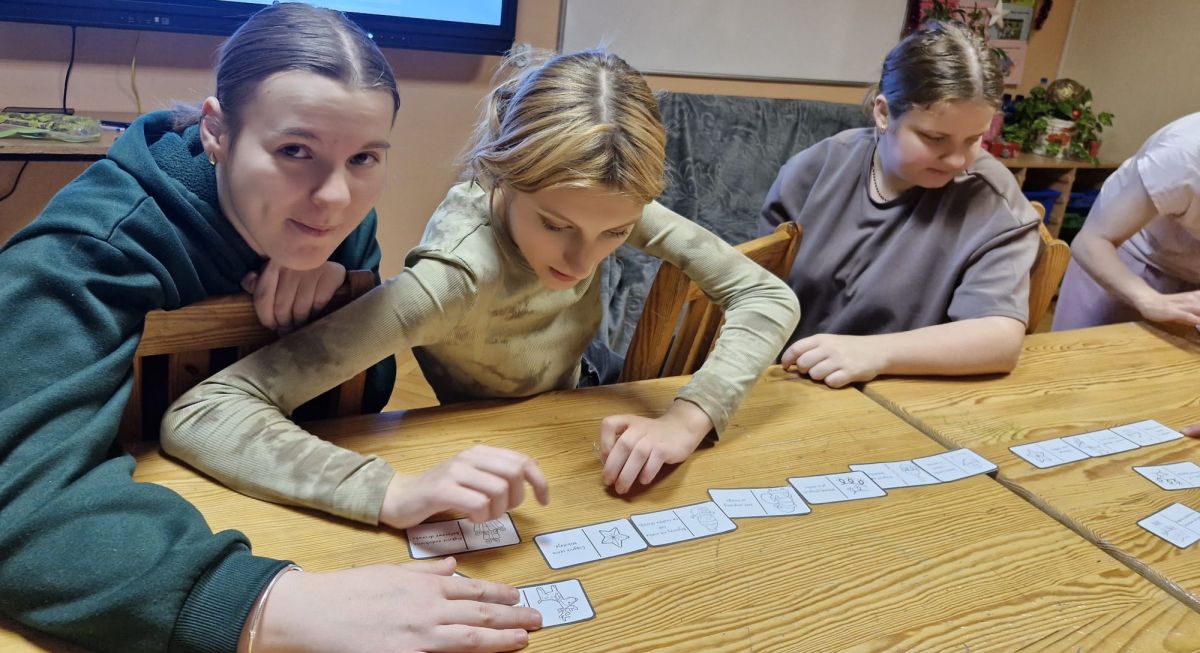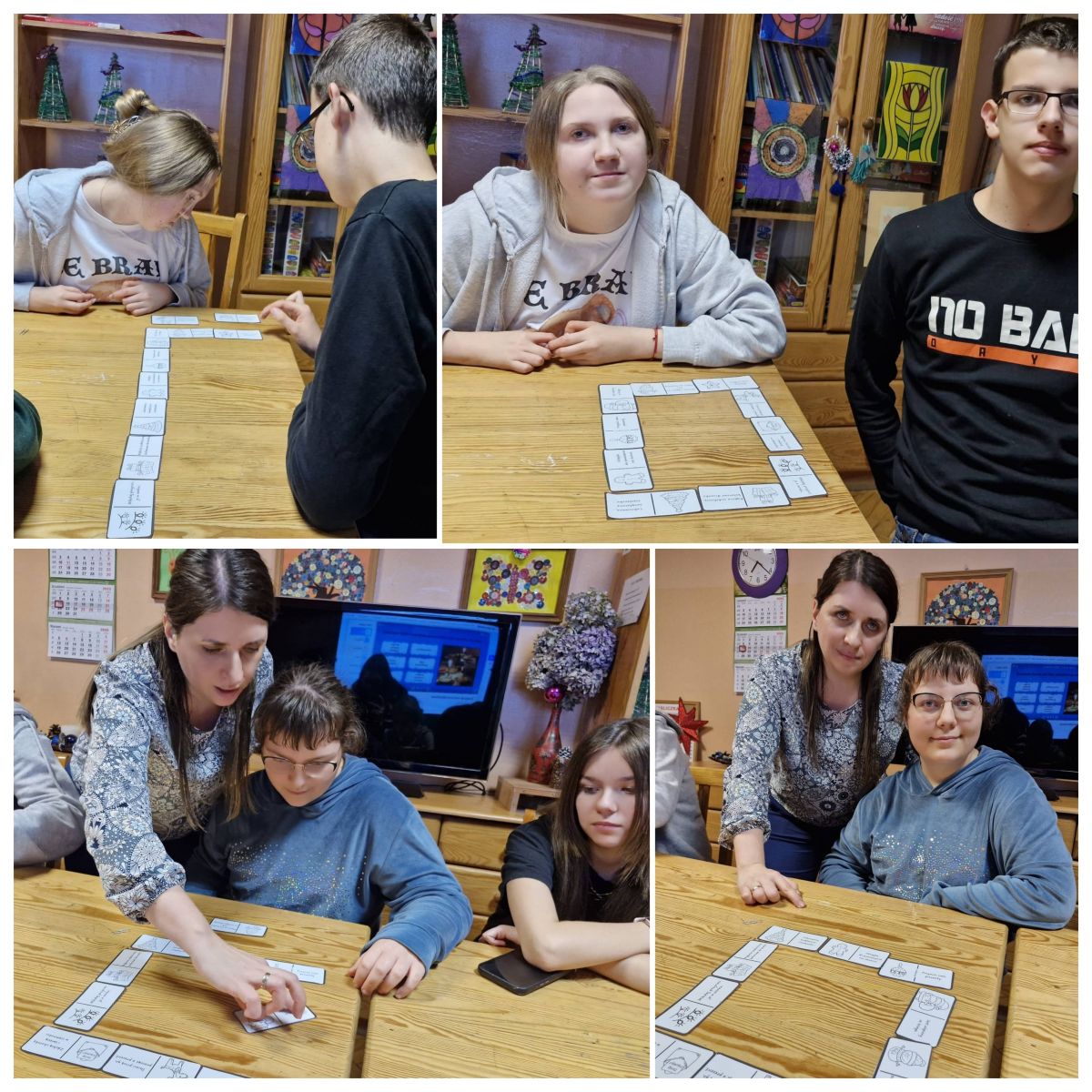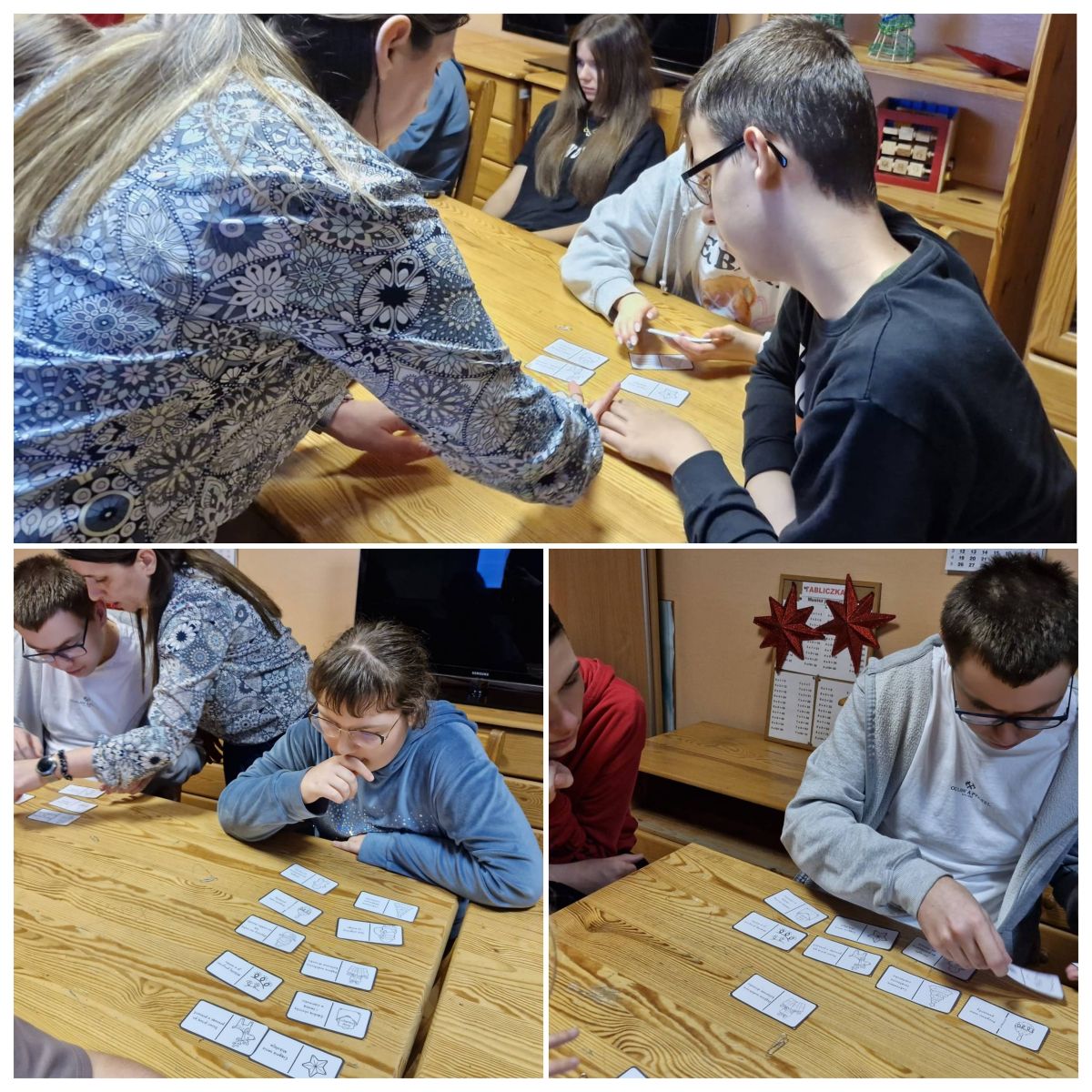 Podopieczni chętnie i z dużym zaangażowaniem uczestniczyli również w grze „Domino – Boże Narodzenie”. Ćwiczenie polegające na czytaniu krótkich informacji tekstowych i dopasowywaniu do nich odpowiednich obrazków rozwijało umiejętność czytania ze zrozumieniem. Ww. gra sprzyjała współpracy, koncentracji oraz aktywności ruchowej. Podopieczni poprawnie interpretowali treść tekstów i z łatwością odnajdywali właściwe ilustracje, a świąteczna tematyka dodatkowo zwiększała ich motywację do pracy.