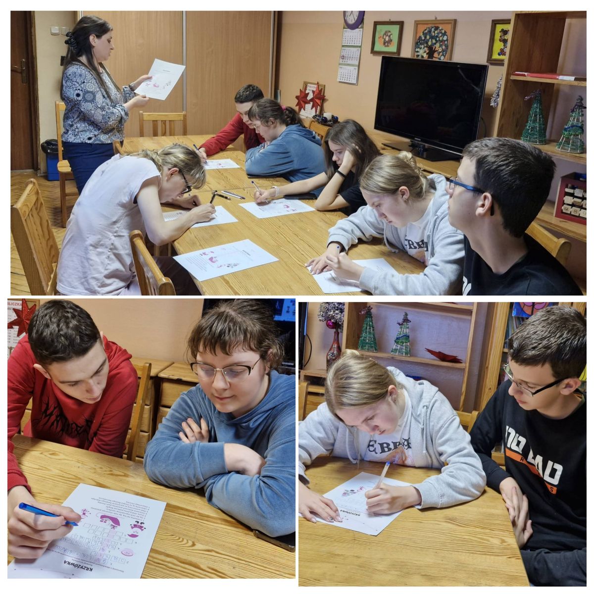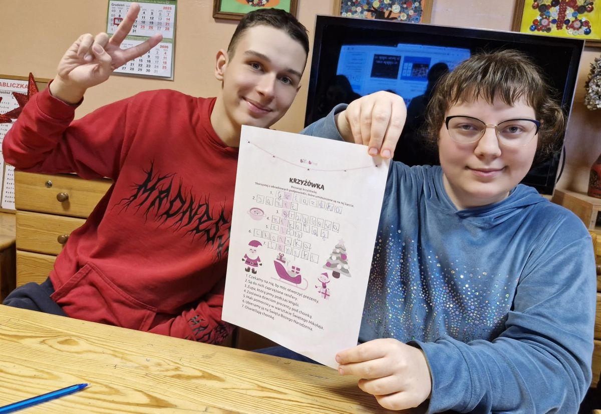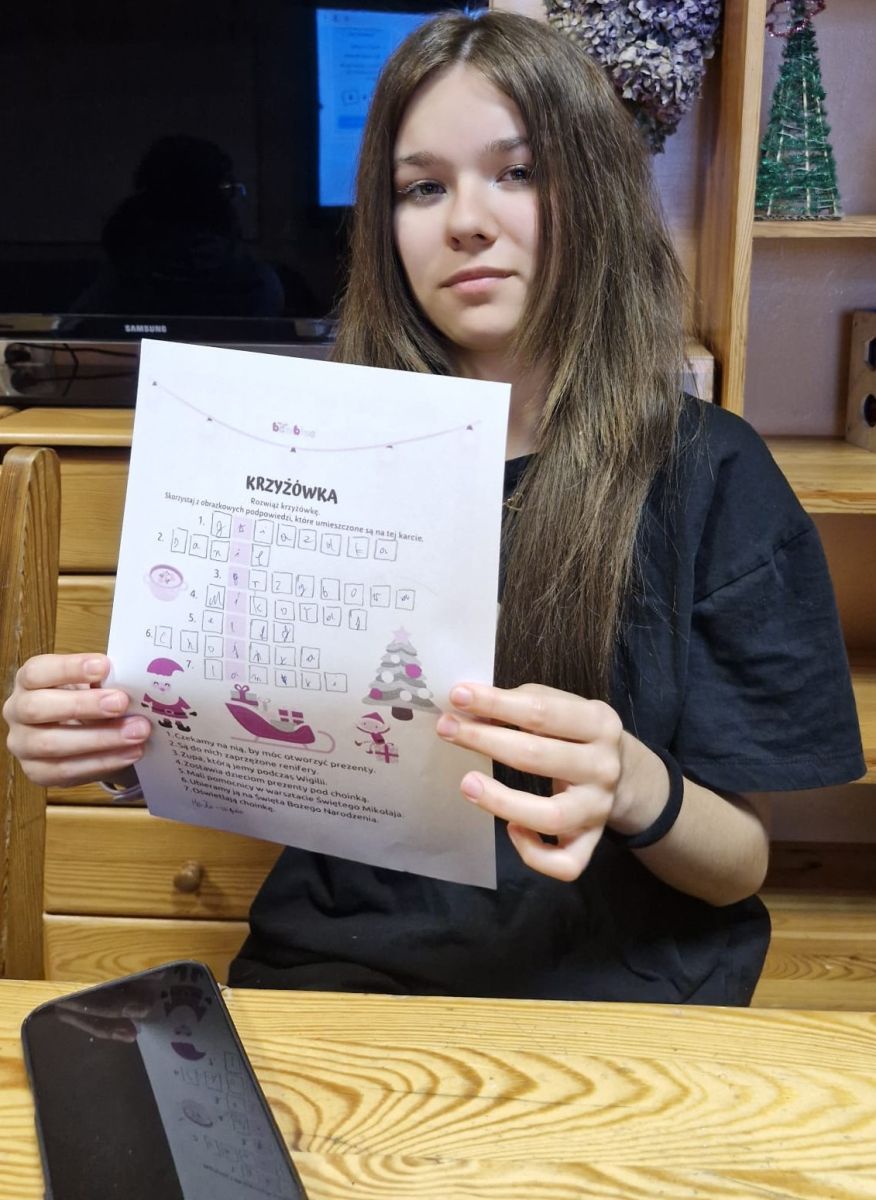 W trakcie zajęć wychowankowie również rozwiązywali krzyżówkę o tematyce świątecznej. Zadanie pozwoliło im utrwalić wiedzę związaną z tradycjami Bożego Narodzenia oraz wzbogacić słownictwo. Praca z krzyżówką była okazją do wspólnej zabawy i aktywnego udziału w zajęciach.