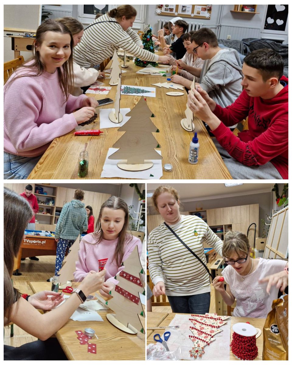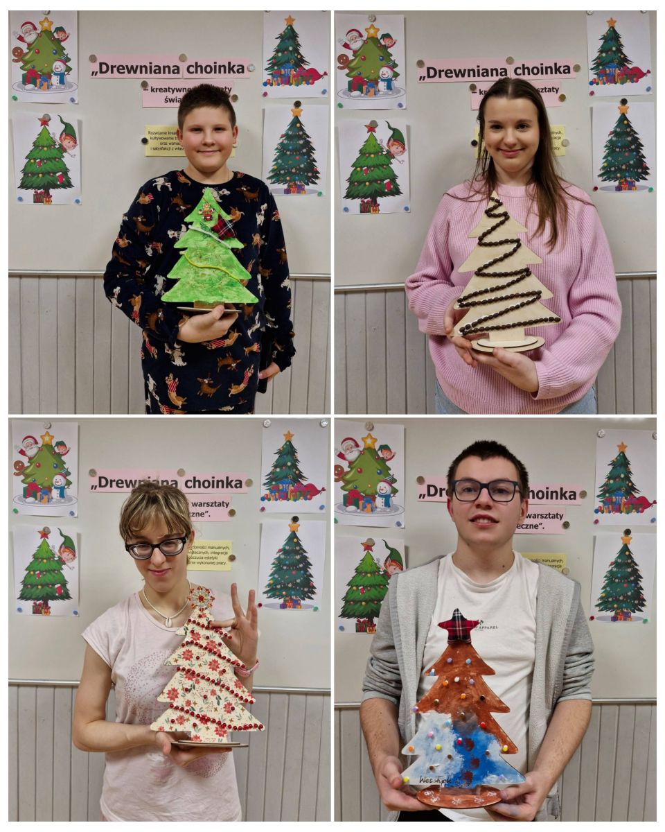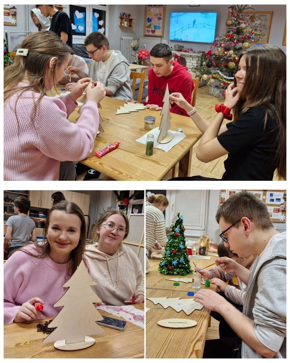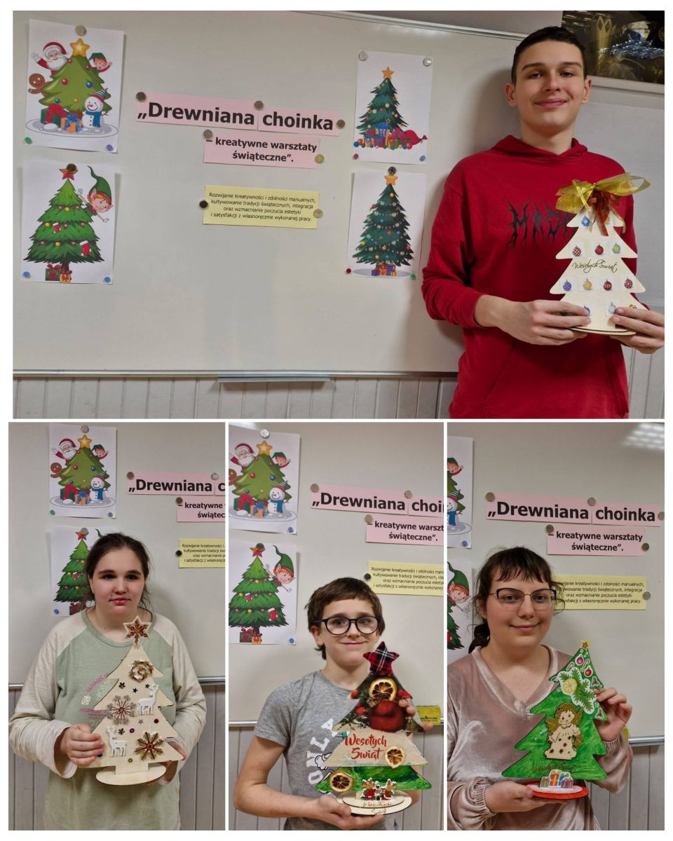Każde dziecko mogło samodzielnie zdecydować, jak chce udekorować swoją choinkę, dzięki czemu praca była twórcza i bardzo indywidualna. Uczestnicy z dużym zaangażowaniem pracowały nad swoimi dekoracjami, wykazując się pomysłowością i starannością. Malowali, wyklejali i ozdabiali, tworząc niepowtarzalne świąteczne dekoracje. Wychowankowie chętnie korzystali z metody decoupage, tzn. wykorzystywali do tego specjalne serwetki z motywami świątecznymi, które przyklejano do powierzchni choinek, a następnie zabezpieczano klejem z wierzchu. Wspólna praca sprzyjała integracji grupy oraz rozwijaniu umiejętności współdziałania. Każda choinka była niepowtarzalna i odzwierciedlała indywidualne pomysły autorów. W czasie zajęć uczniowie słuchali kolęd, które wprowadziły wszystkich w świąteczny nastrój.
