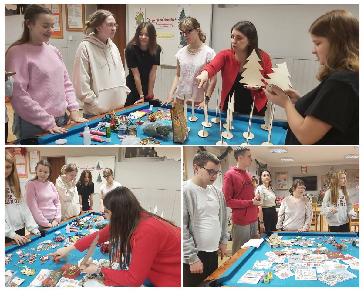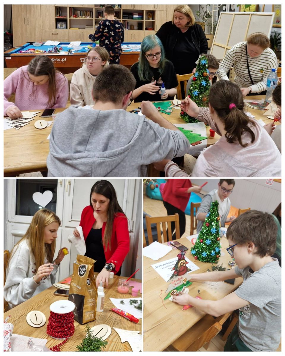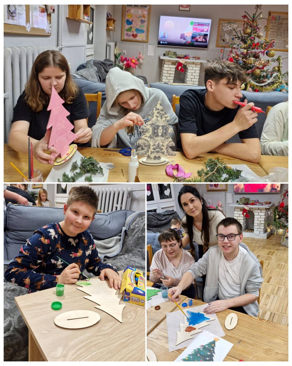 Każde dziecko mogło samodzielnie zdecydować, jak chce udekorować swoją choinkę, dzięki czemu praca była twórcza i bardzo indywidualna. Uczestnicy z dużym zaangażowaniem pracowały nad swoimi dekoracjami, wykazując się pomysłowością i starannością. Malowali, wyklejali i ozdabiali, tworząc niepowtarzalne świąteczne dekoracje. Wychowankowie chętnie korzystali z metody decoupage, tzn. wykorzystywali do tego specjalne serwetki z motywami świątecznymi, które przyklejano do powierzchni choinek, a następnie zabezpieczano klejem z wierzchu. Wspólna praca sprzyjała integracji grupy oraz rozwijaniu umiejętności współdziałania. Każda choinka była niepowtarzalna i odzwierciedlała indywidualne pomysły autorów. W czasie zajęć uczniowie słuchali kolęd, które wprowadziły wszystkich w świąteczny nastrój.