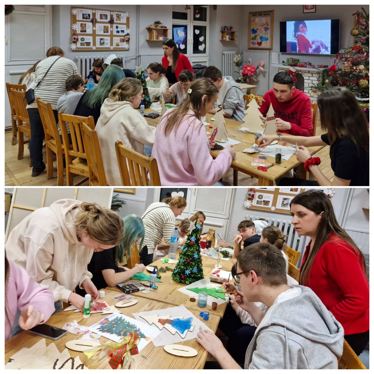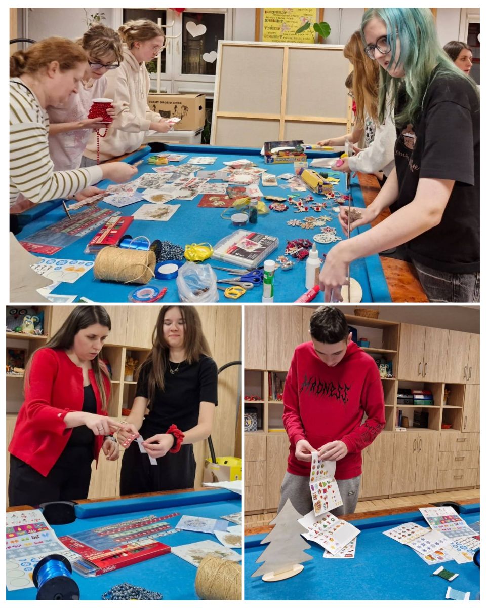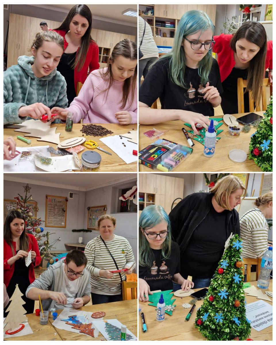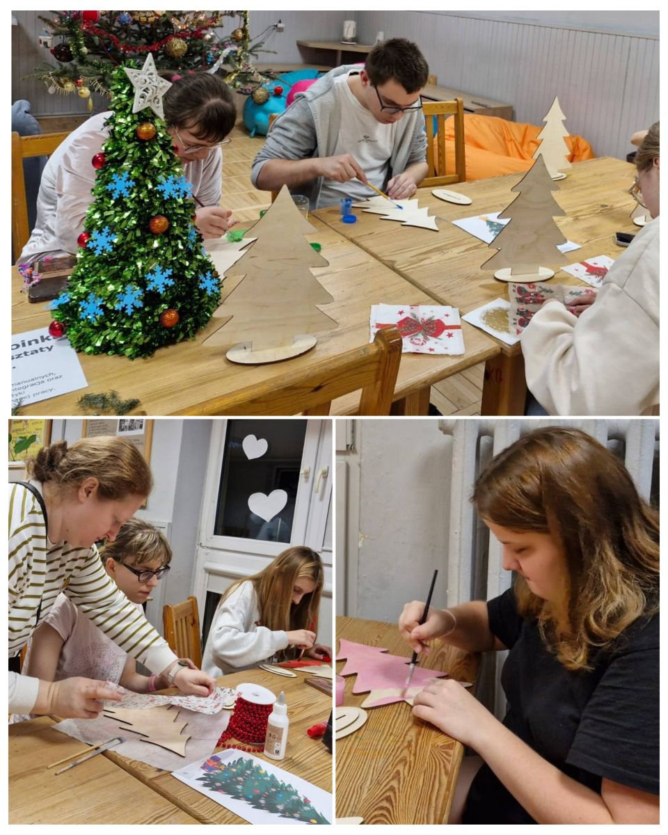 Każde dziecko mogło samodzielnie zdecydować, jak chce udekorować swoją choinkę, dzięki czemu praca była twórcza i bardzo indywidualna. Uczestnicy z dużym zaangażowaniem pracowały nad swoimi dekoracjami, wykazując się pomysłowością i starannością. Malowali, wyklejali i ozdabiali, tworząc niepowtarzalne świąteczne dekoracje. Wychowankowie chętnie korzystali z metody decoupage, tzn. wykorzystywali do tego specjalne serwetki z motywami świątecznymi, które przyklejano do powierzchni choinek, a następnie zabezpieczano klejem z wierzchu. Wspólna praca sprzyjała integracji grupy oraz rozwijaniu umiejętności współdziałania. Każda choinka była niepowtarzalna i odzwierciedlała indywidualne pomysły autorów. W czasie zajęć uczniowie słuchali kolęd, które wprowadziły wszystkich w świąteczny nastrój.
