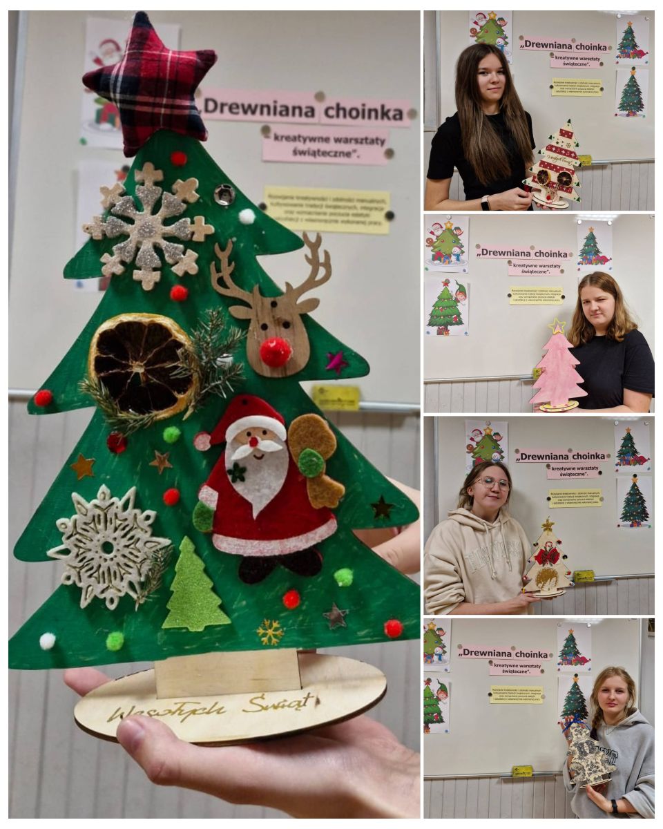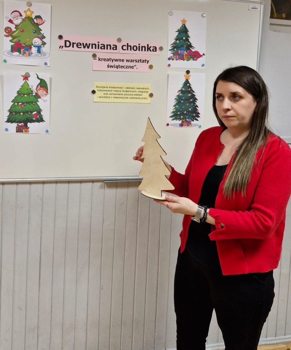 W dniu 16 grudnia 2025 roku, w świetlicy odbyły się kreatywne warsztaty świąteczne pod hasłem „Drewniana choinka”. Zajęcia miały na celu rozwijanie wyobraźni, kreatywności i umiejętności plastycznych poprzez samodzielne projektowanie oraz ozdabianie świątecznej choinki (wykonanej ze sklejki), z wykorzystaniem wybranych materiałów i technik dekoracyjnych, a także sprzyjały koncentracji i samodzielności oraz wprowadzenie uczestników w radosny, świąteczny nastrój.