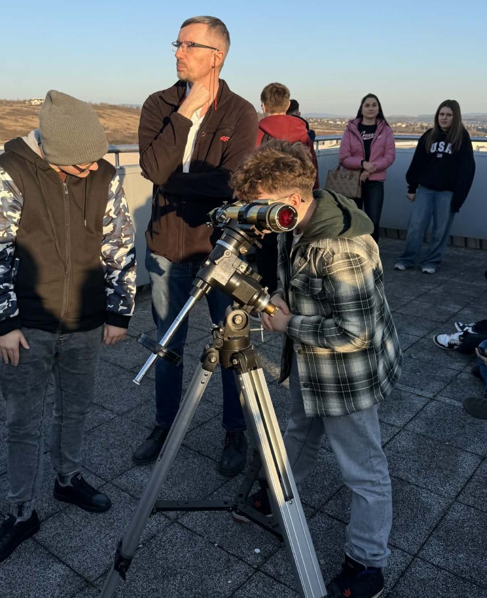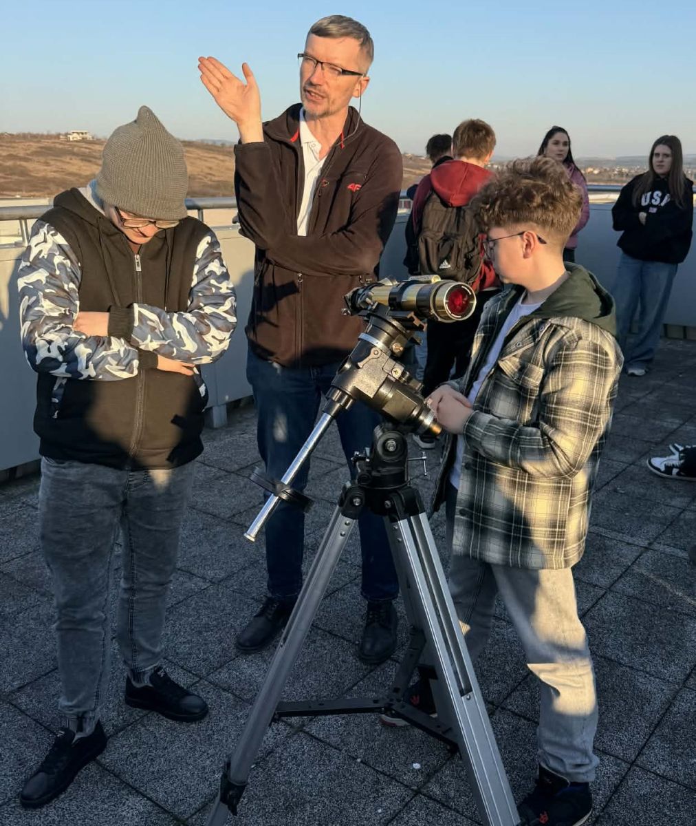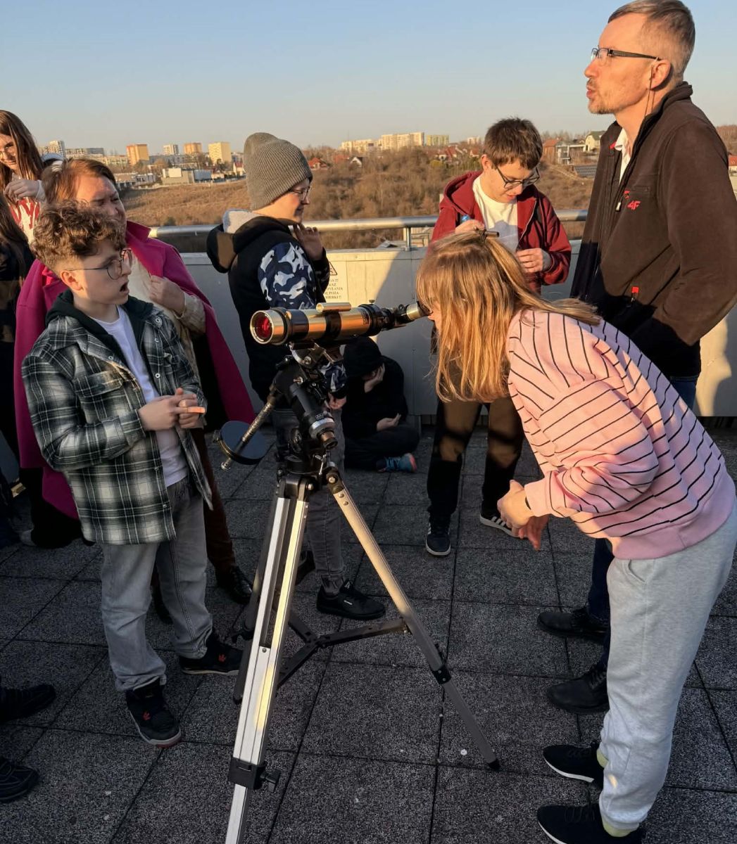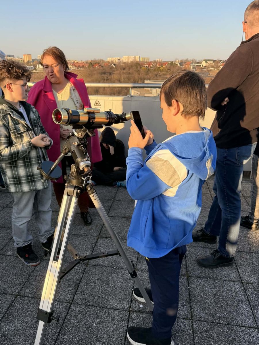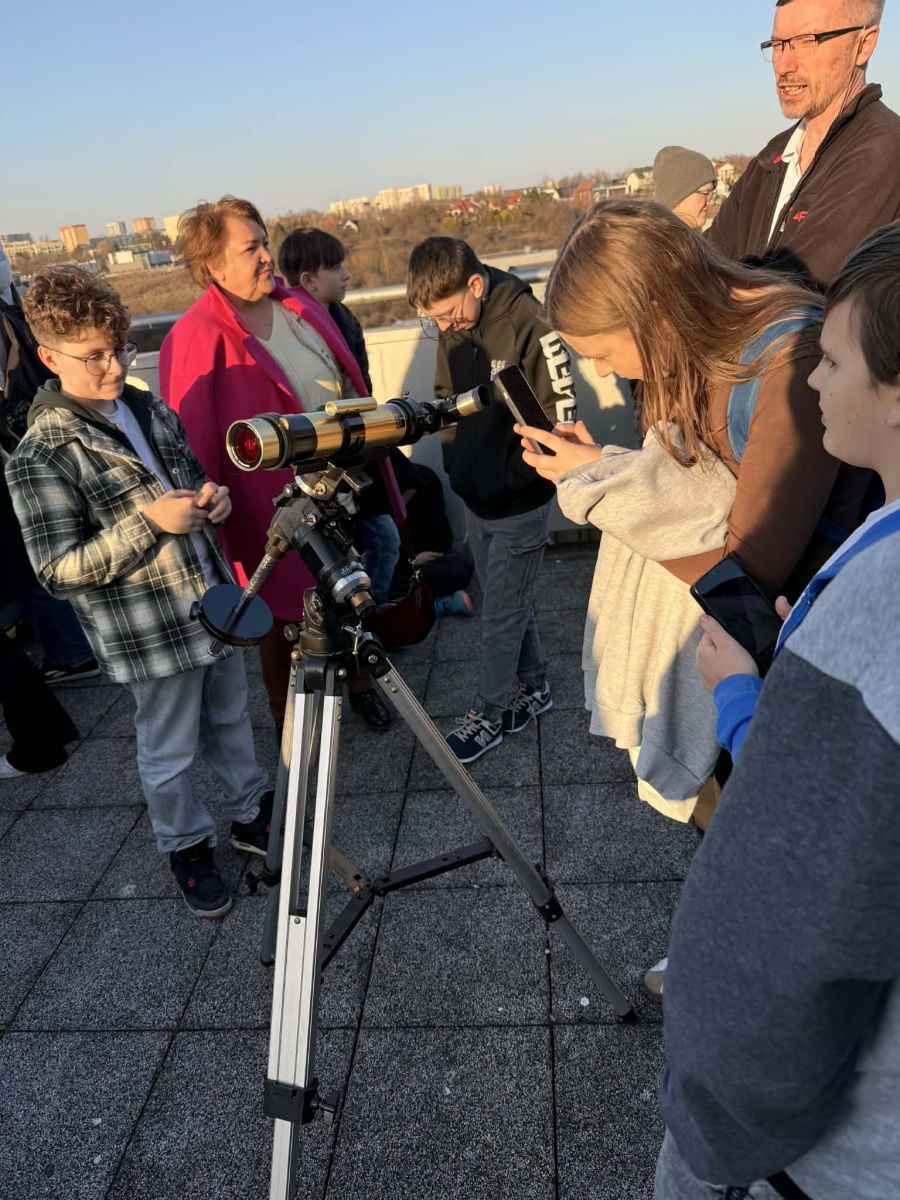 Podczas wizyty uczestnicy mieli możliwość obserwacji Słońca przez teleskop Lunt, który umożliwia bezpieczne oglądanie powierzchni naszej gwiazdy. Była to niezwykle ciekawa okazja, aby zobaczyć z bliska szczegóły Słońca i dowiedzieć się więcej o jego budowie oraz zjawiskach zachodzących na jego powierzchni.