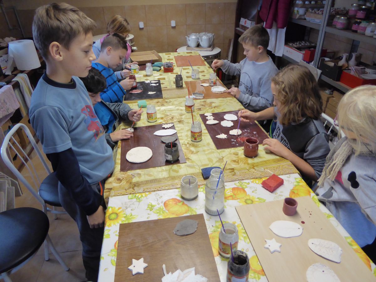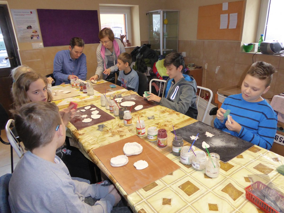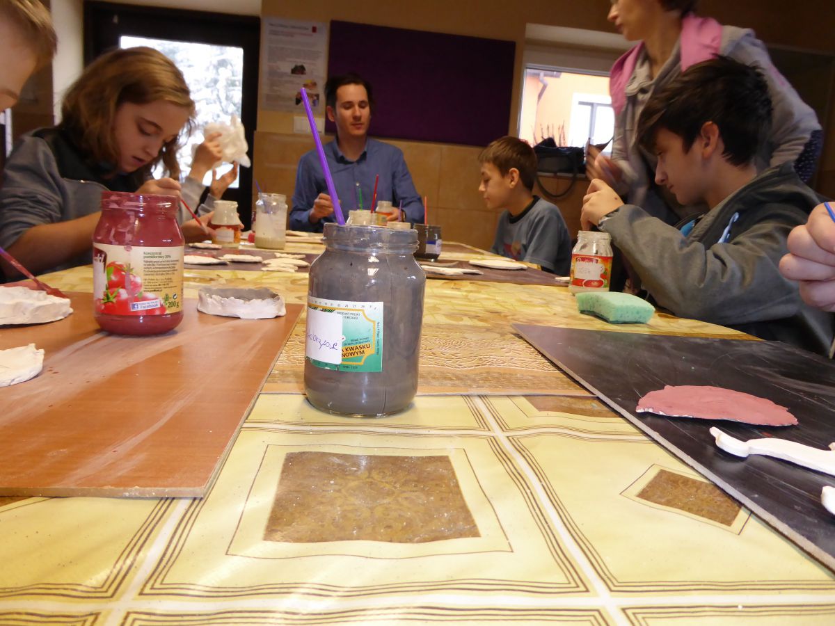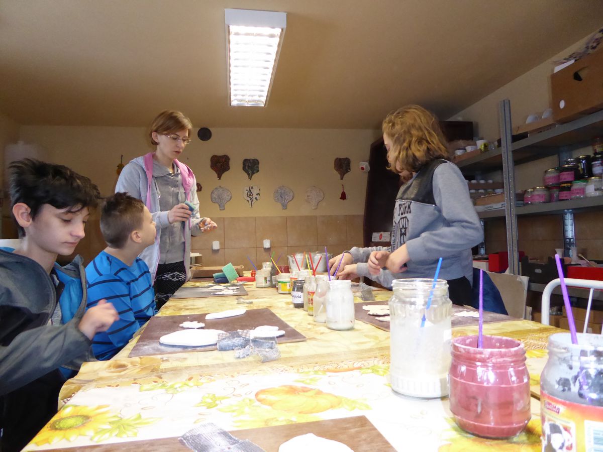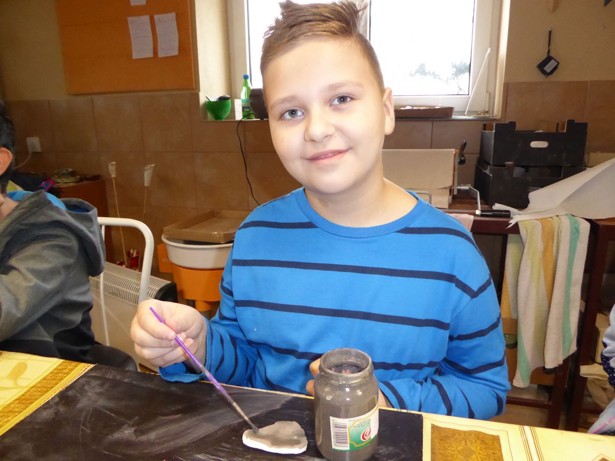 1 grudnia uczniowie klasy 4 szkoły podstawowej uczestniczyli w warsztatach w Pracowni Ceramiki Regionalnej CEMI w Świętej Katarzynie koło Kielc. Pracownię prowadzi pani Monika Iwan - absolwentka UJK w Kielcach na kierunku Wzornictwo, Policealnego Studium Projektowania Ubioru oraz Studium Projektowania i Konstrukcji Obuwia w Szkole Artystycznego Projektowania Ubioru w Krakowie. Pracę dyplomową na kierunku Wzornictwo pani Monika wykonała w ceramice i porcelanie – i właśnie to medium jest jej ulubionym materiałem w jakim pracuje. Warsztaty były już drugim spotkaniem dzieci ze sztuką tworzenia wyrobów ceramicznych. Na pierwszych zajęciach uczniowie poznali podstawowe metody pracy z gliną i pracowali w tym materiale. Wykonane przez nich prace zostały następnie wypalone w Pracowni w specjalnie do tego przystosowanych piecach. Tym razem nasi uczniowie poznali różnorodne techniki zdobienia wyrobów ceramicznych oraz sposoby ich obróbki. Przygotowali też wypalone prace do malowania i samodzielnie pokrywali je szkliwem. Po tych zabiegach prace zostaną poddane ostatniej obróbce cieplnej, w wyniku której szkliwo stwardnieje oraz nabierze właściwego sobie połysku i koloru. Już jesteśmy ciekawi, jak niepowtarzalne będą prace dzieci. Czy uczniom się podobało? Myślimy, że po obejrzeniu zdjęć z warsztatów właściwa odpowiedź nasunie się sama.