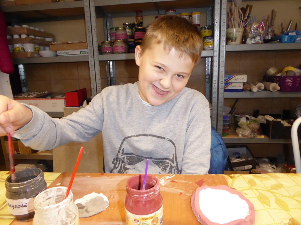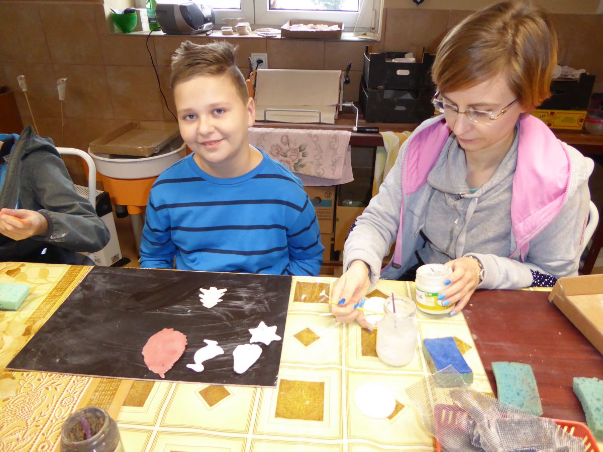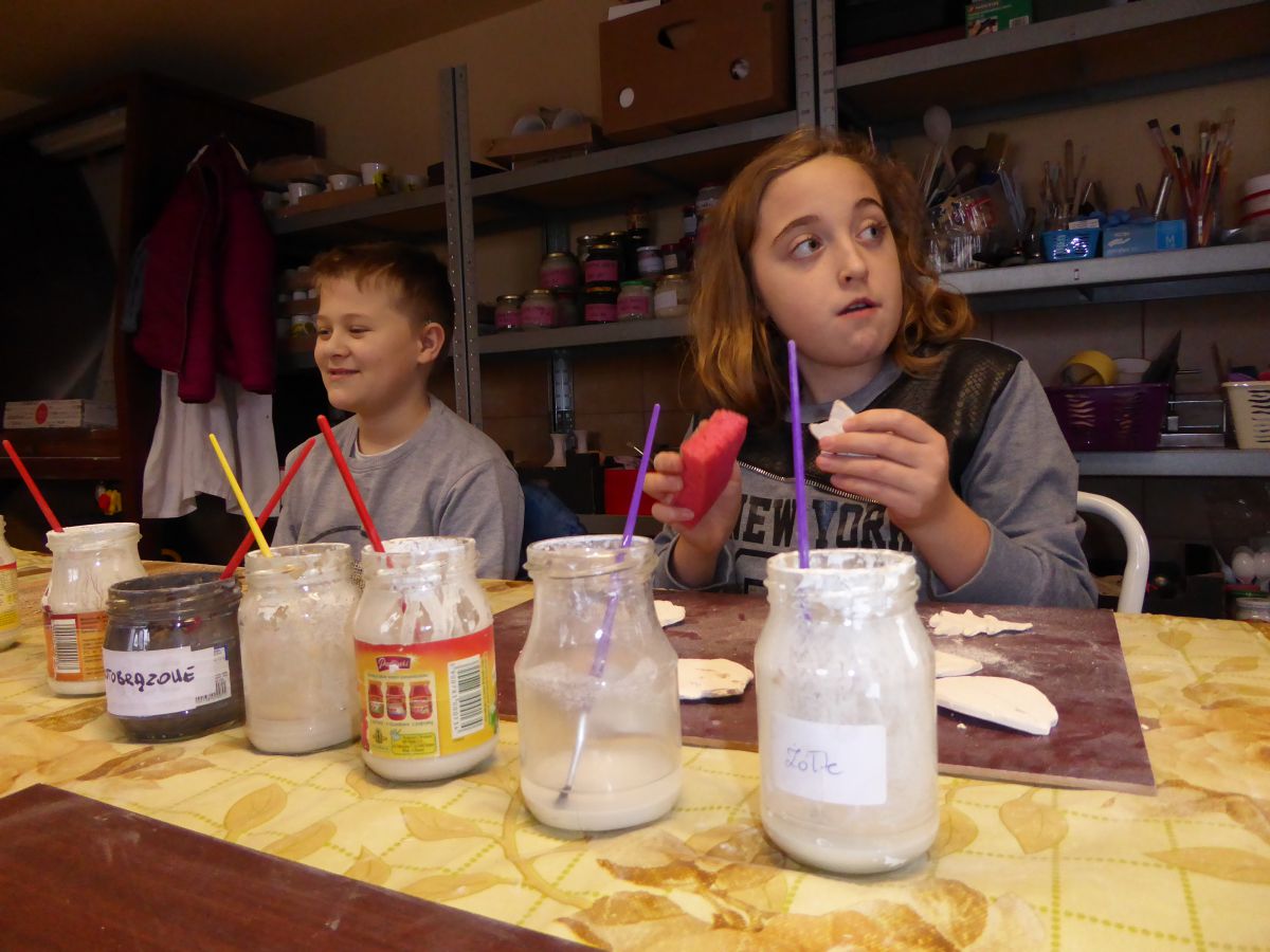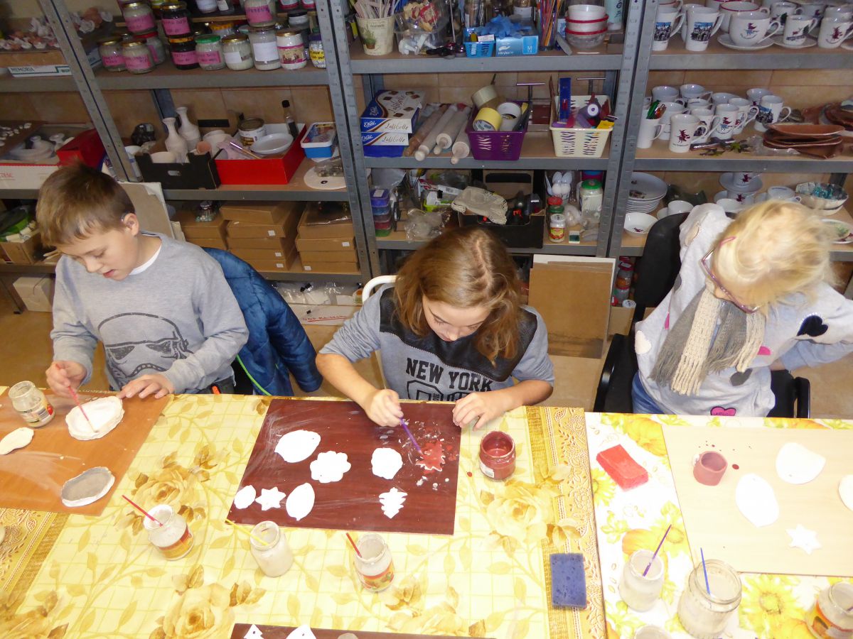 1 grudnia uczniowie klasy 4 szkoły podstawowej uczestniczyli w warsztatach w Pracowni Ceramiki Regionalnej CEMI w Świętej Katarzynie koło Kielc. Pracownię prowadzi pani Monika Iwan - absolwentka UJK w Kielcach na kierunku Wzornictwo, Policealnego Studium Projektowania Ubioru oraz Studium Projektowania i Konstrukcji Obuwia w Szkole Artystycznego Projektowania Ubioru w Krakowie. Pracę dyplomową na kierunku Wzornictwo pani Monika wykonała w ceramice i porcelanie – i właśnie to medium jest jej ulubionym materiałem w jakim pracuje. Warsztaty były już drugim spotkaniem dzieci ze sztuką tworzenia wyrobów ceramicznych. Na pierwszych zajęciach uczniowie poznali podstawowe metody pracy z gliną i pracowali w tym materiale. Wykonane przez nich prace zostały następnie wypalone w Pracowni w specjalnie do tego przystosowanych piecach. Tym razem nasi uczniowie poznali różnorodne techniki zdobienia wyrobów ceramicznych oraz sposoby ich obróbki. Przygotowali też wypalone prace do malowania i samodzielnie pokrywali je szkliwem. Po tych zabiegach prace zostaną poddane ostatniej obróbce cieplnej, w wyniku której szkliwo stwardnieje oraz nabierze właściwego sobie połysku i koloru. Już jesteśmy ciekawi, jak niepowtarzalne będą prace dzieci. Czy uczniom się podobało? Myślimy, że po obejrzeniu zdjęć z warsztatów właściwa odpowiedź nasunie się sama.