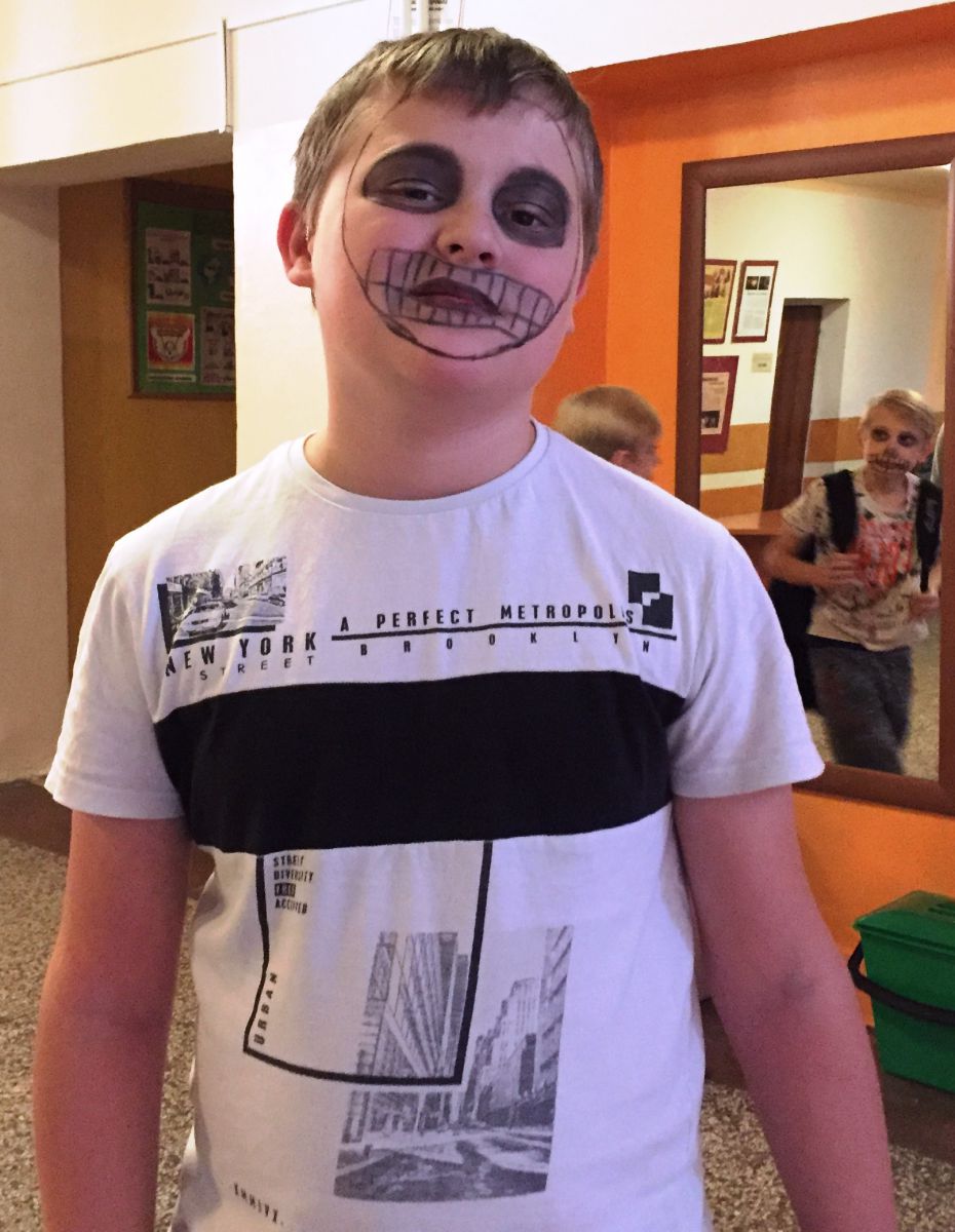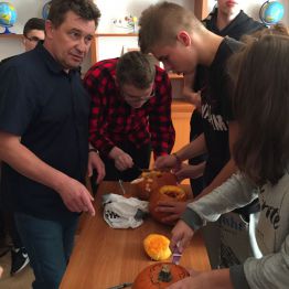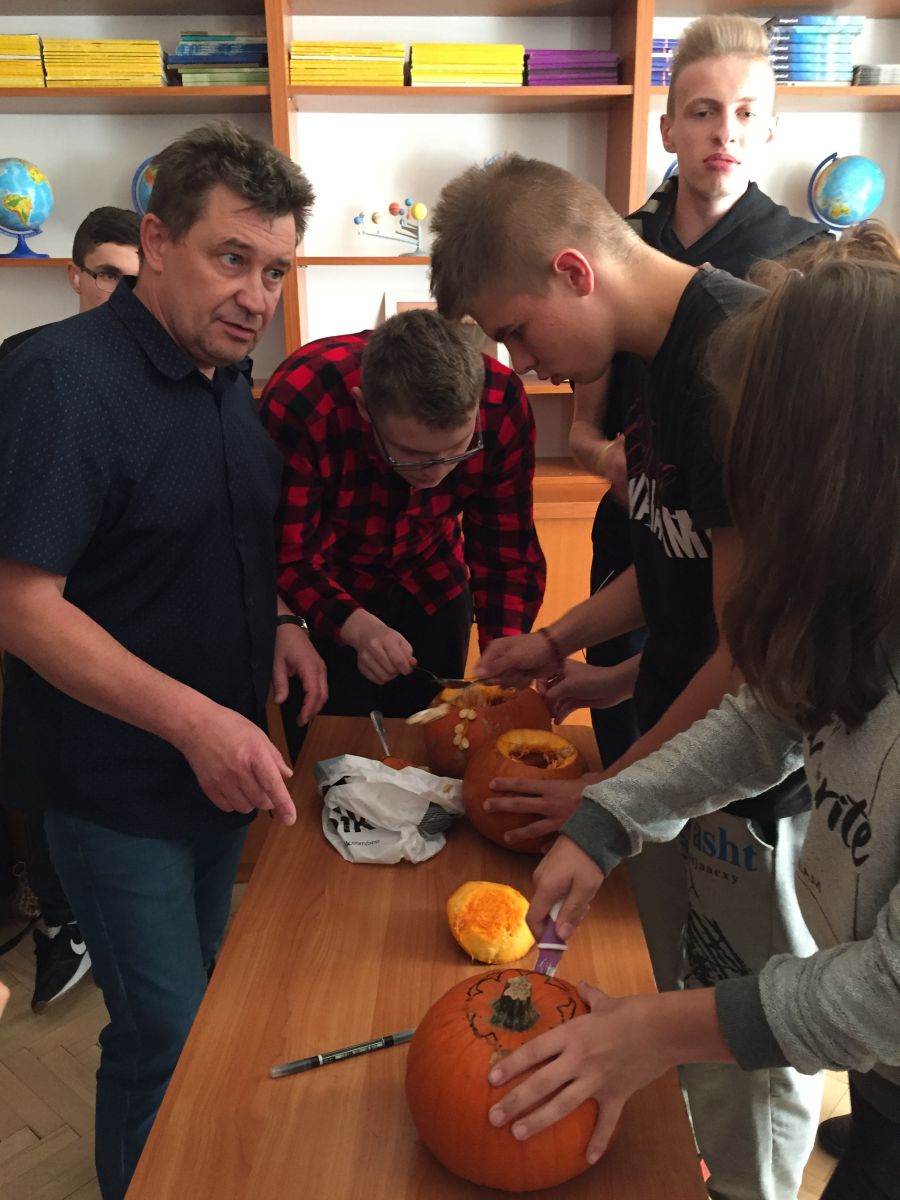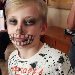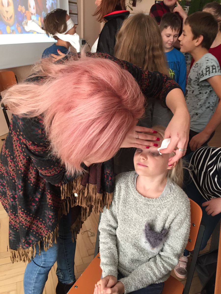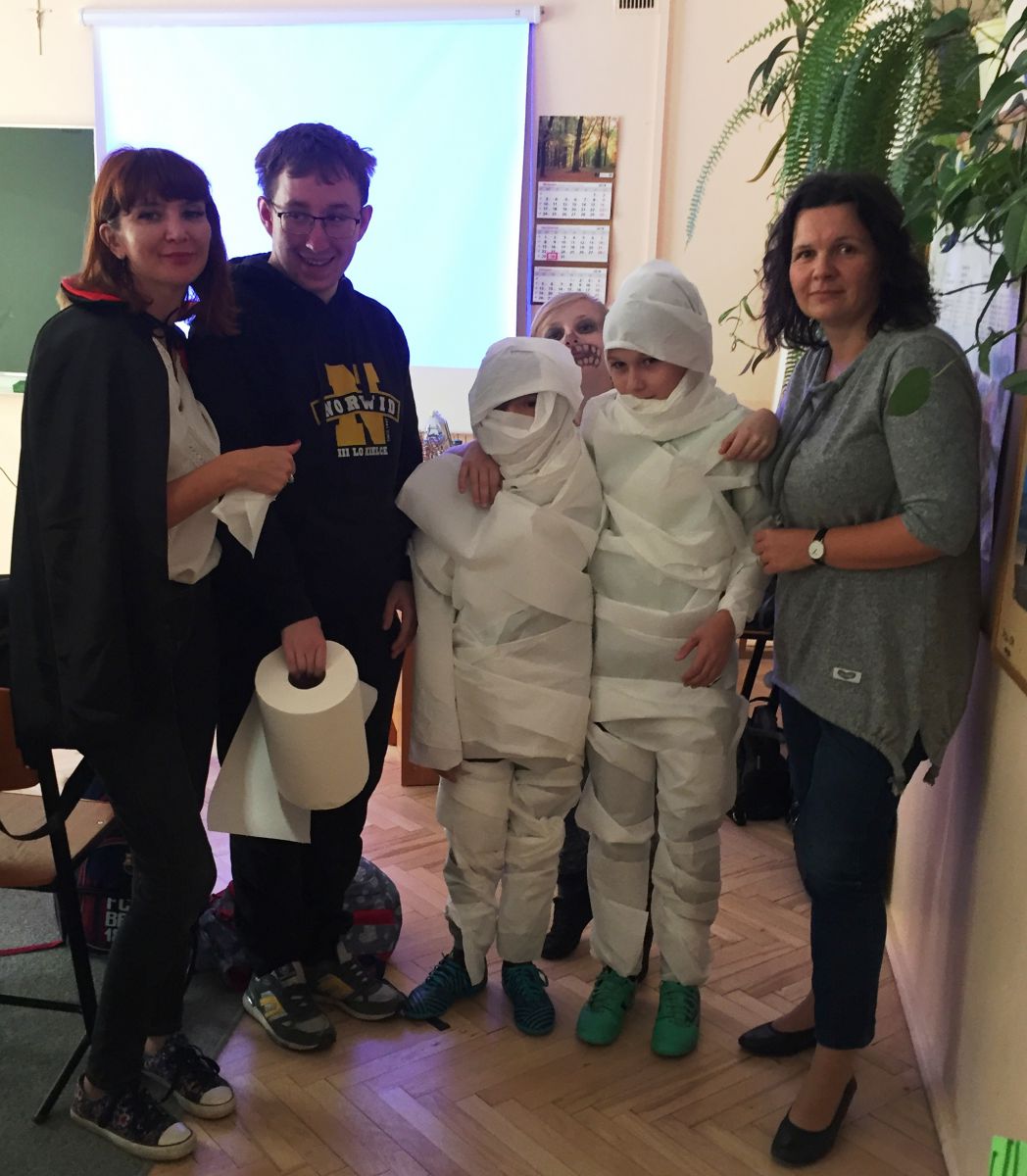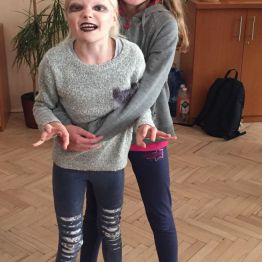 Dziś odbyła się nietypowa lekcja języka angielskiego, której celem było przybliżenie zwyczajów i symboli święta Halloween. Uczniowie mieli okazję dowiedzieć się gdzie i dlaczego narodziła się ta tradycja, poznać angielskie słownictwo związane z obchodami Halloween, a także uczestniczyć w kilku typowych zabawach z nim związanych. Było zatem tworzenie pajęczej sieci, rysowanie straszliwych potworów, a nawet owijanie mumii. Oprócz tego malowanie twarzy, konkurs rysunków i wydrążania dyni oraz tworzenia z nich słynnych Jack-o'-Lanterns. Uczestnicy konkursów otrzymali w nagrodę słodycze, jak w znanej zabawie "Trick or treat" czyli ,,Cukierek albo psikus". Wszyscy świetnie się bawili, a przy okazji wiele nauczyli!