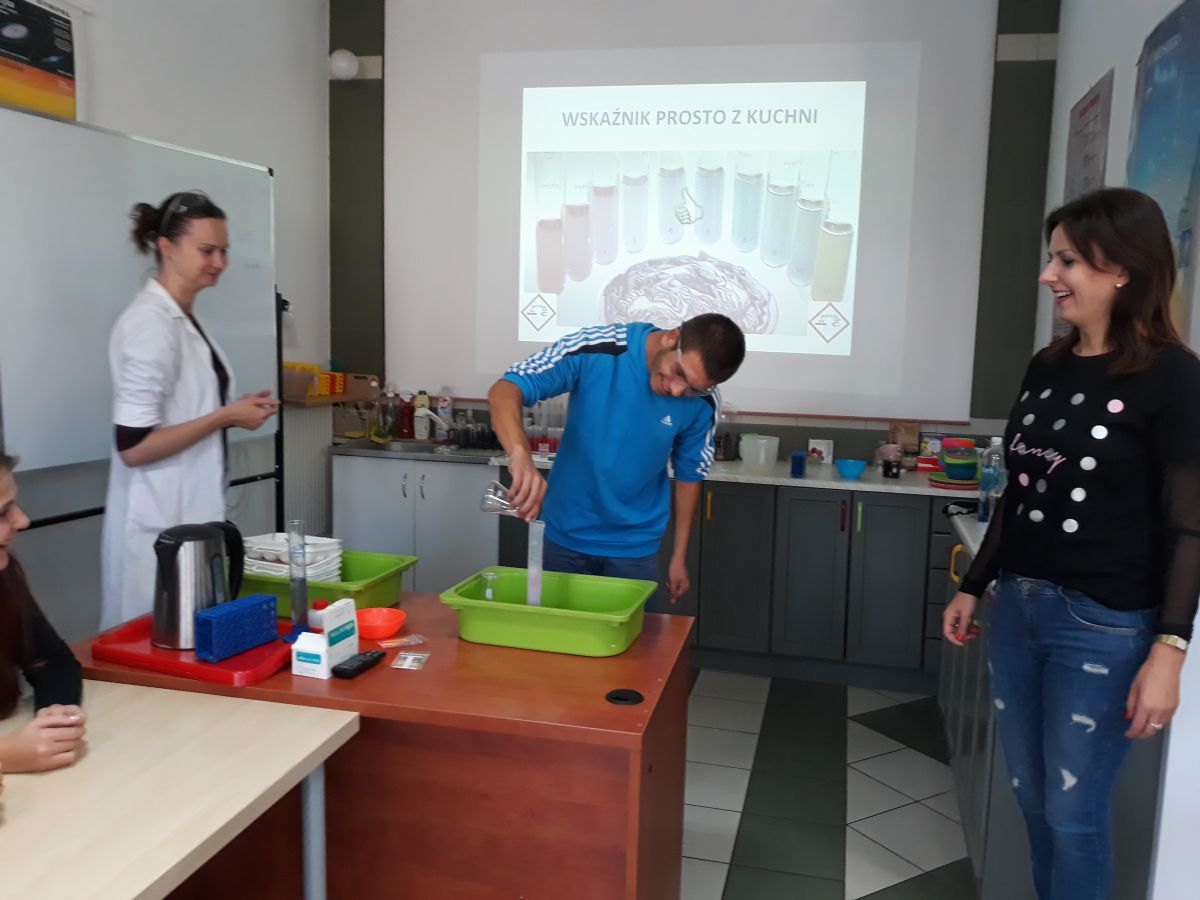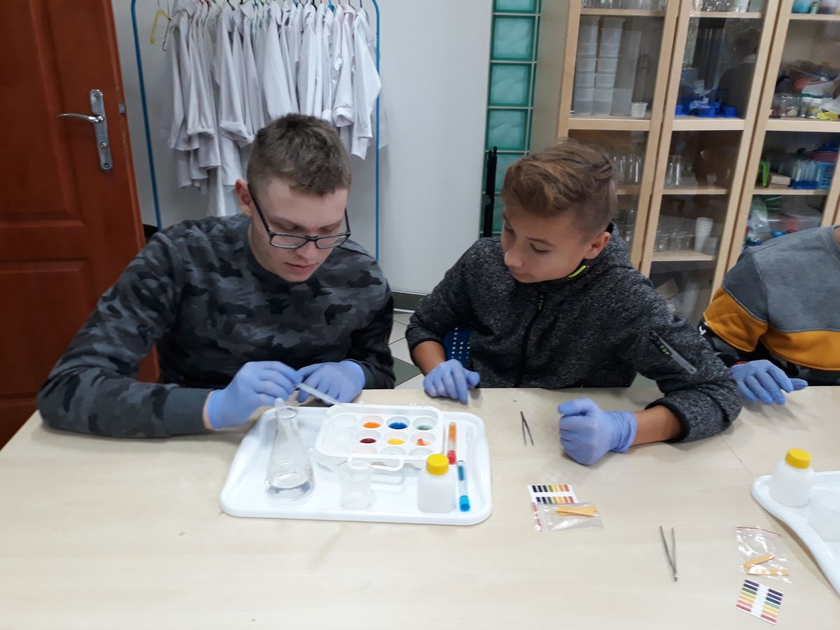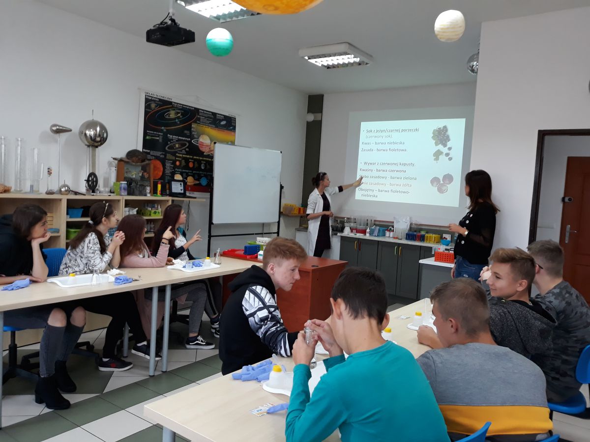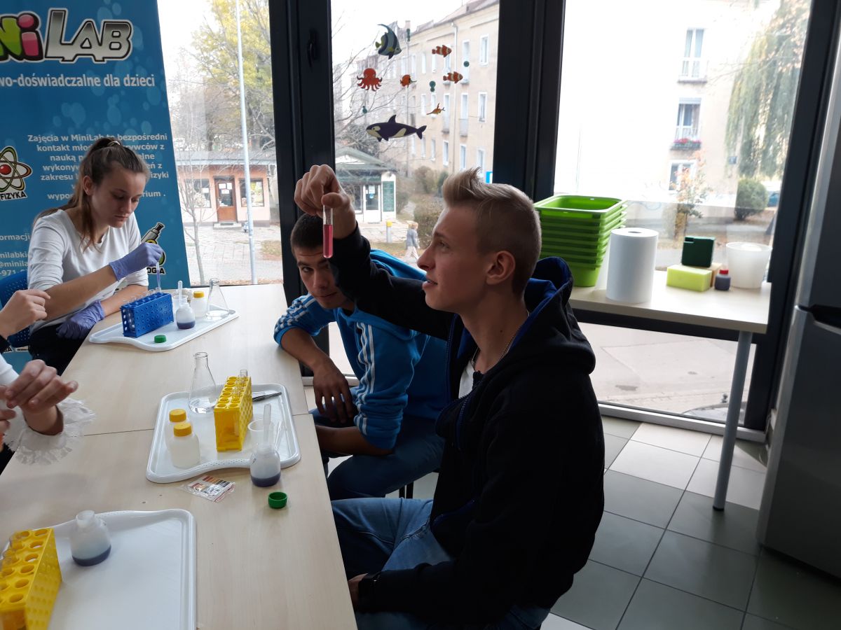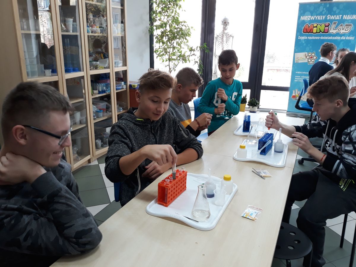 29 października uczniowie klas gimnazjalnych brali udział w warsztatach chemicznych w pracowni MINI-LAB przy ulicy Zagórskiej w Kielcach. Tematem zajęć było ,,pH roztworów". Uczniowie najpierw wysłuchali wykładu, a następnie samodzielnie przeprowadzali doświadczenia. Badali odczyny roztworów za pomocą różnych wskaźników i odczytywali wartości pH korzystając z odpowiedniej skali. Młodzież z wielką uwagą wysłuchała wykładu. Z równie dużym zaangażowaniem wykonywała doświadczenia i eksperymenty. Wierzymy, że takie lekcje zostaną trwale zapamiętane przez uczniów, czego im i sobie bardzo życzymy :)