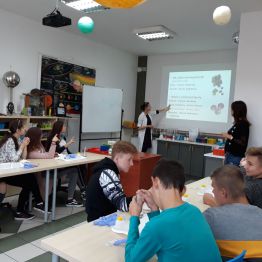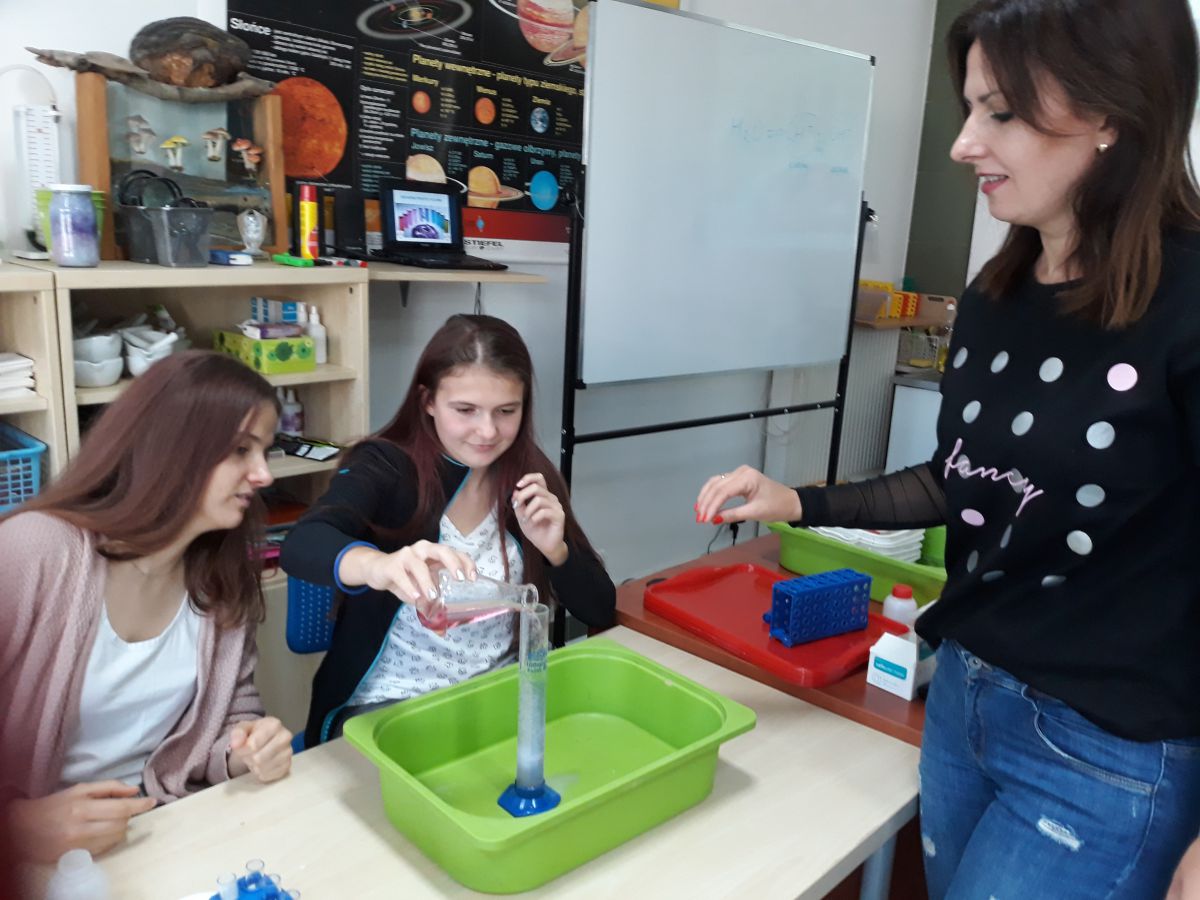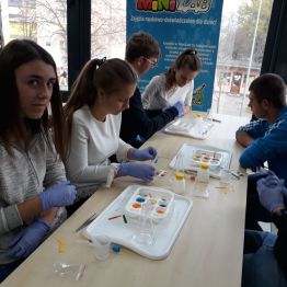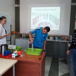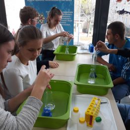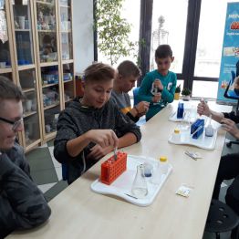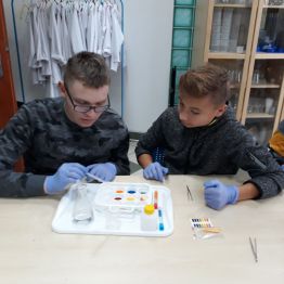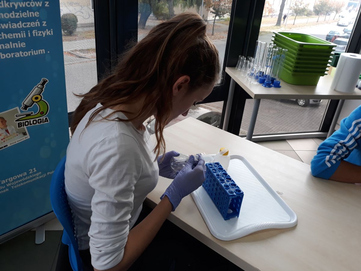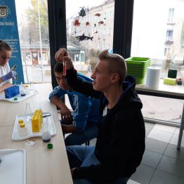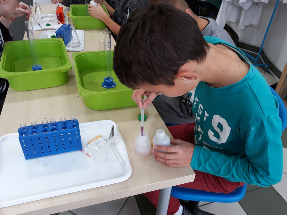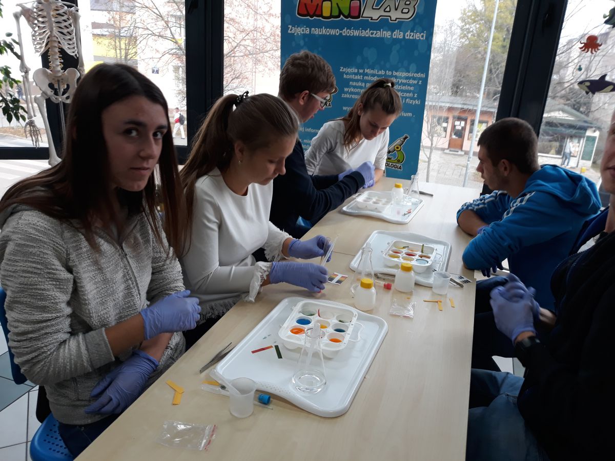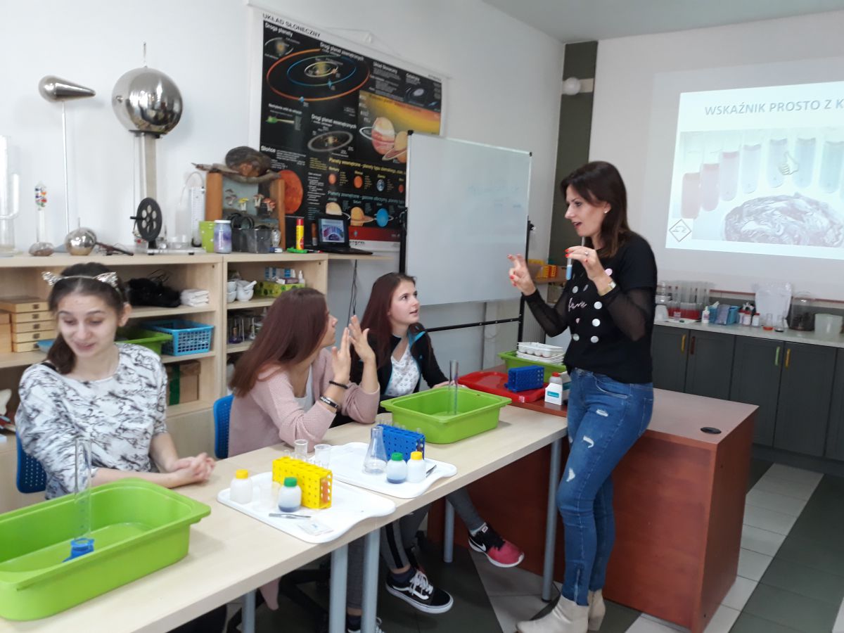 29 października uczniowie klas gimnazjalnych brali udział w warsztatach chemicznych w pracowni MINI-LAB przy ulicy Zagórskiej w Kielcach. Tematem zajęć było ,,pH roztworów". Uczniowie najpierw wysłuchali wykładu, a następnie samodzielnie przeprowadzali doświadczenia. Badali odczyny roztworów za pomocą różnych wskaźników i odczytywali wartości pH korzystając z odpowiedniej skali. Młodzież z wielką uwagą wysłuchała wykładu. Z równie dużym zaangażowaniem wykonywała doświadczenia i eksperymenty. Wierzymy, że takie lekcje zostaną trwale zapamiętane przez uczniów, czego im i sobie bardzo życzymy :)