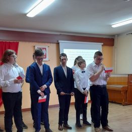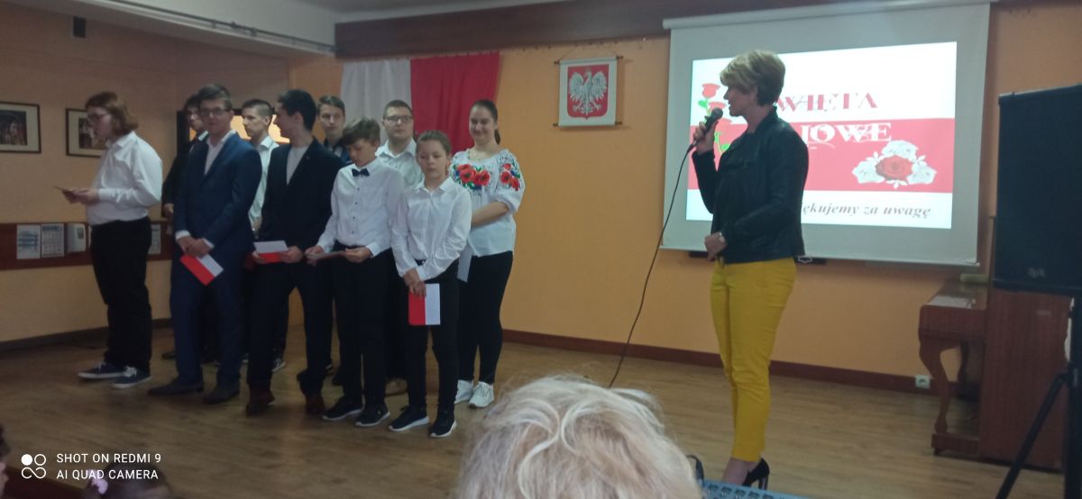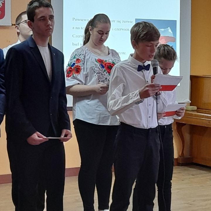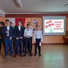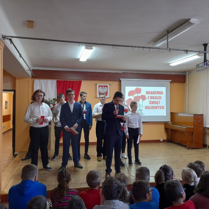 W dniu dzisiejszym w naszej szkole odbyła się uroczysta akademia z okazji Świąt Majowych. Poprzez krótką lekcję historii, odświętnie ubrani uczniowie, przybliżyli nam najważniejsze wiadomości o tych świętach.
