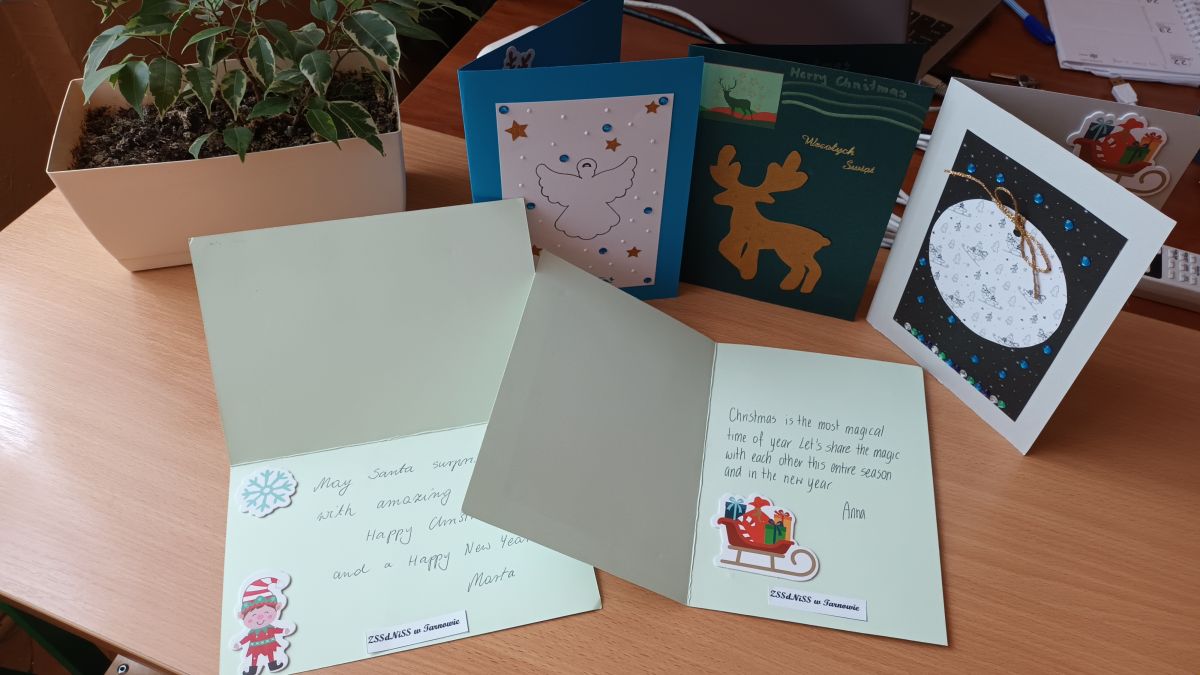 Czas przedświąteczny to szczególny okres, przepełniony radością i dobrymi życzeniami. W tym roku uczniowie kl. 3cBS uczestniczyli w wymianie kartek bożonarodzeniowych w języku angielskim. Wraz z p. Eweliną Rusinowicz, nauczycielką języka angielskiego, uczniowie wykonali kartki świąteczne z życzeniami w języku angielskim. Kartki trafiły do uczniów Zespołu Szkół Specjalnych dla Niesłyszących i Słabo Słyszących w Tarnowie. Mamy nadzieję, że nasze kartki sprawiły uczniom radość, a wszystkie dobre życzenia niech się spełnią.