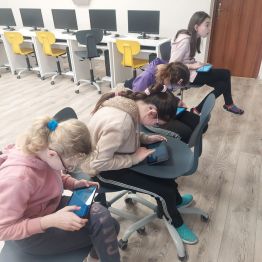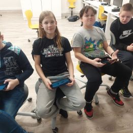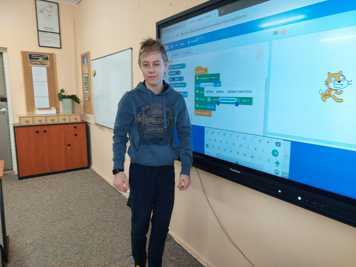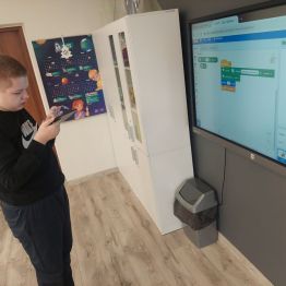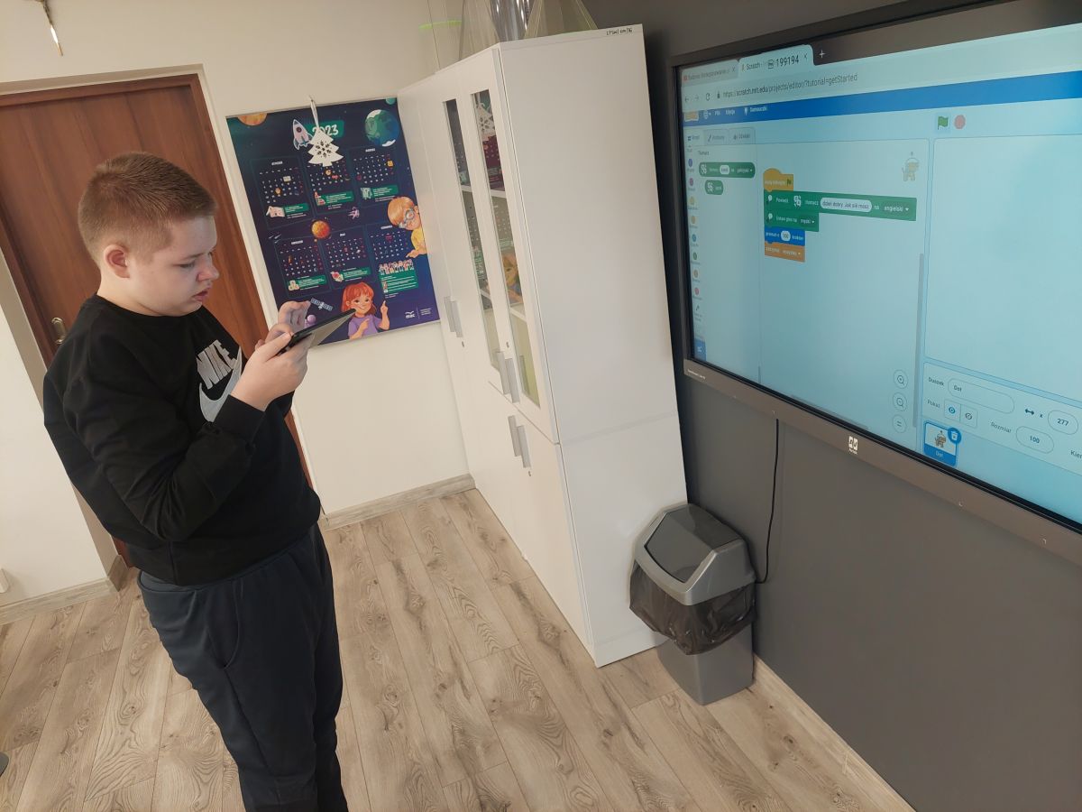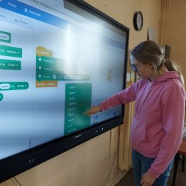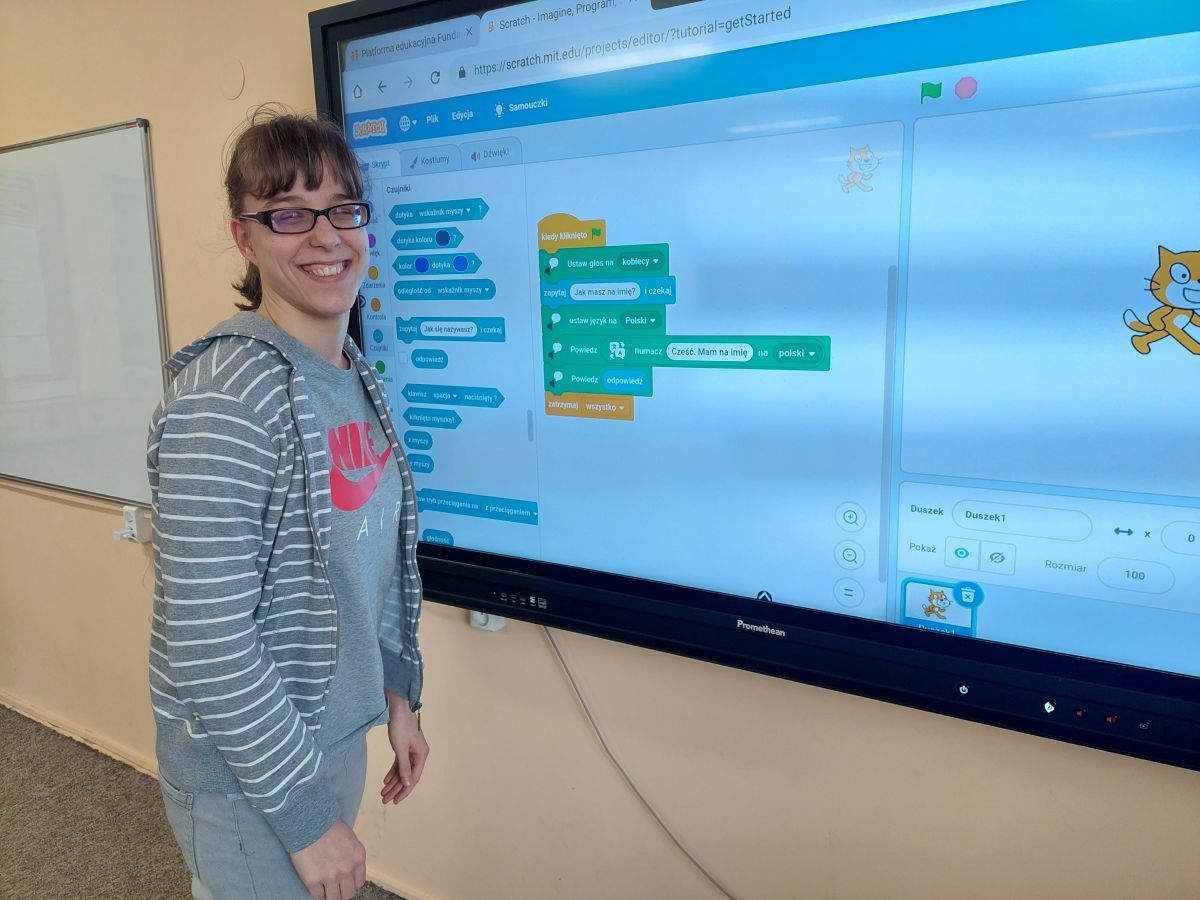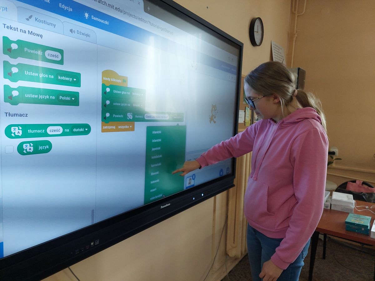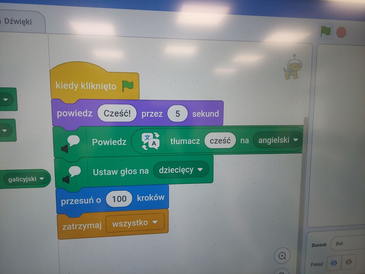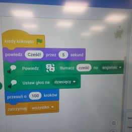 Podczas pierwszego spotkania korzystaliśmy z rozszerzeń w programie Scratch, które pozwalają na odczytanie tekstu przez lektora oraz wielojęzycznego tłumacza. Napisaliśmy wiele ciekawych programów. Klikając w link, można sprawdzić, jak działa jeden z nich: