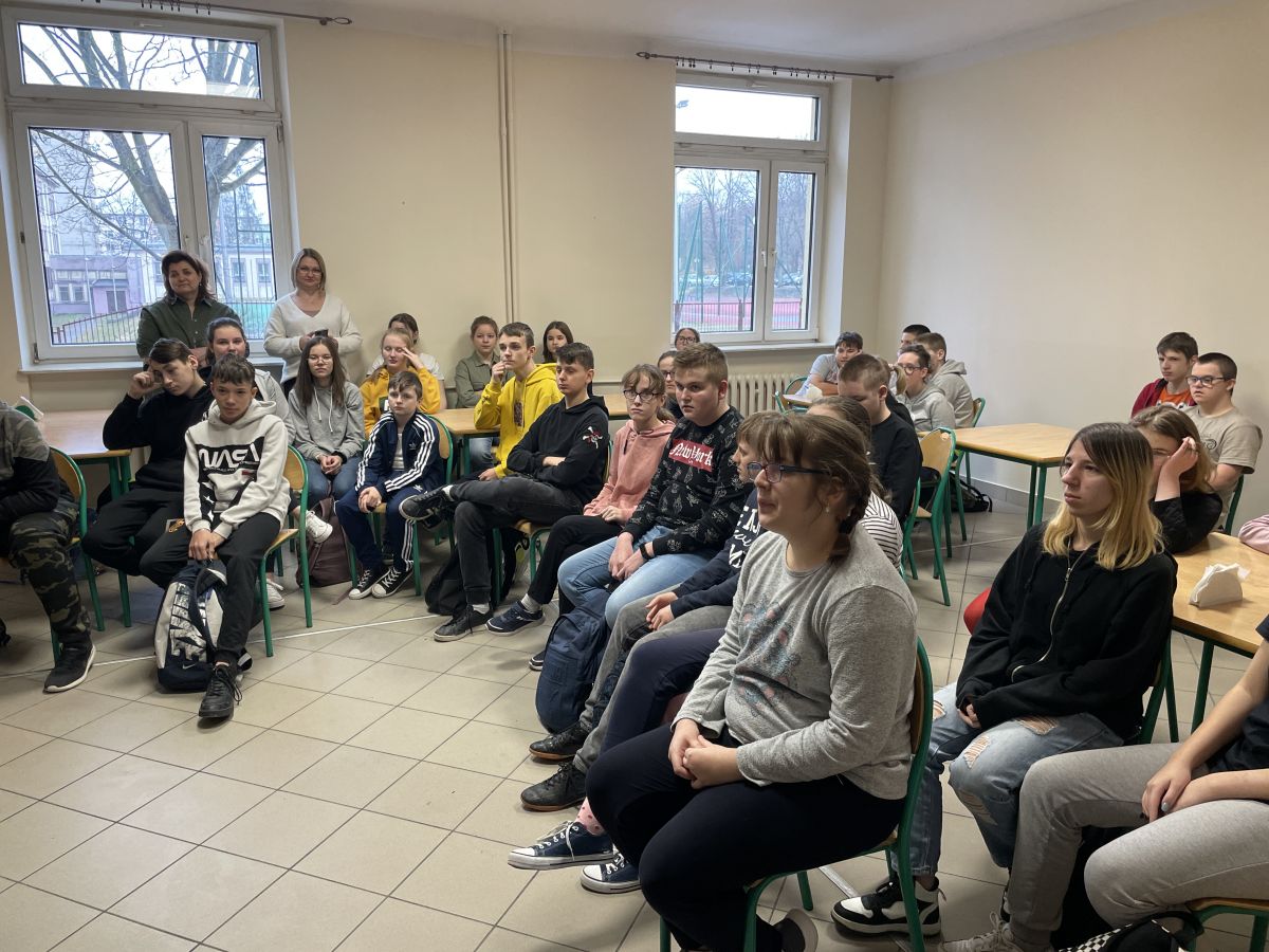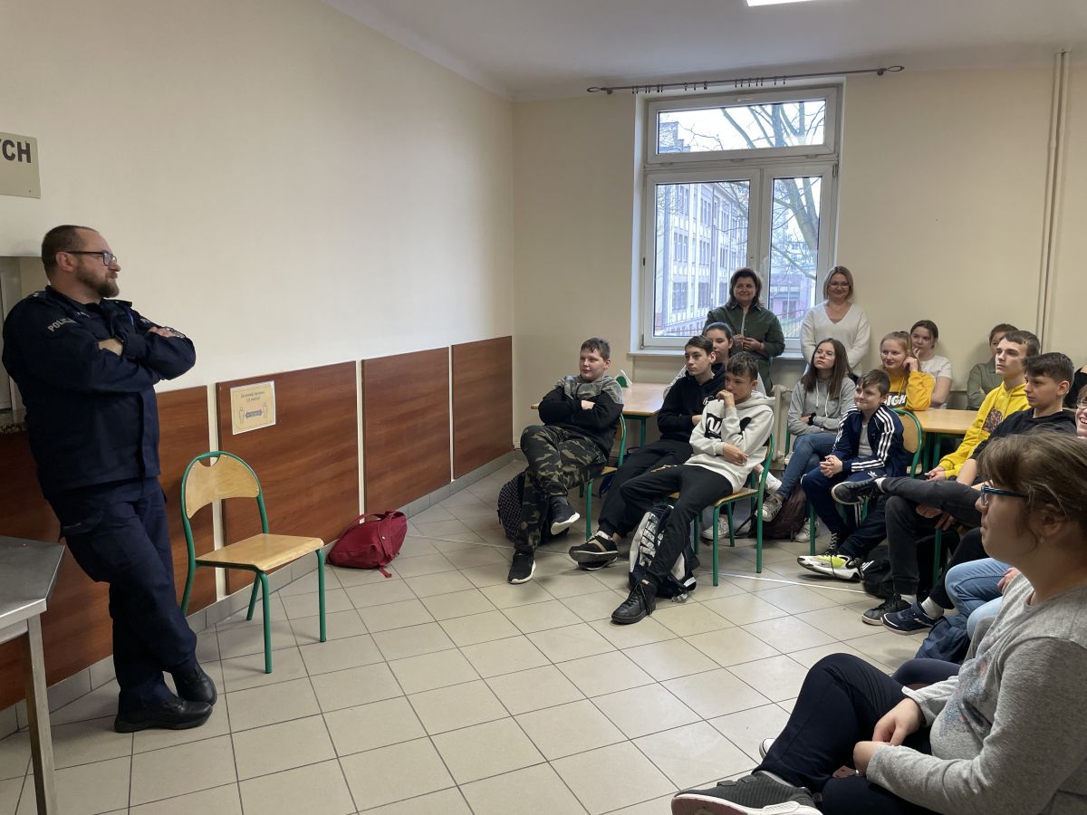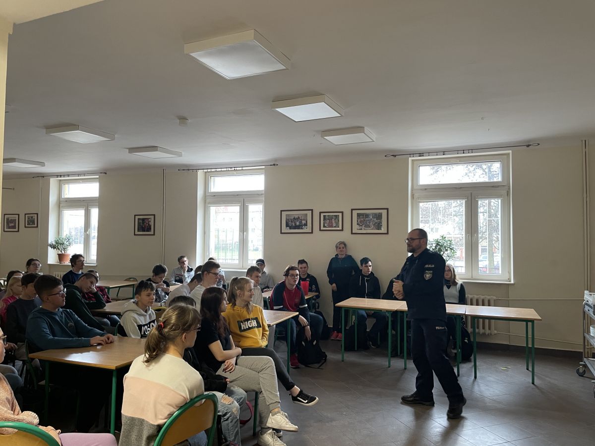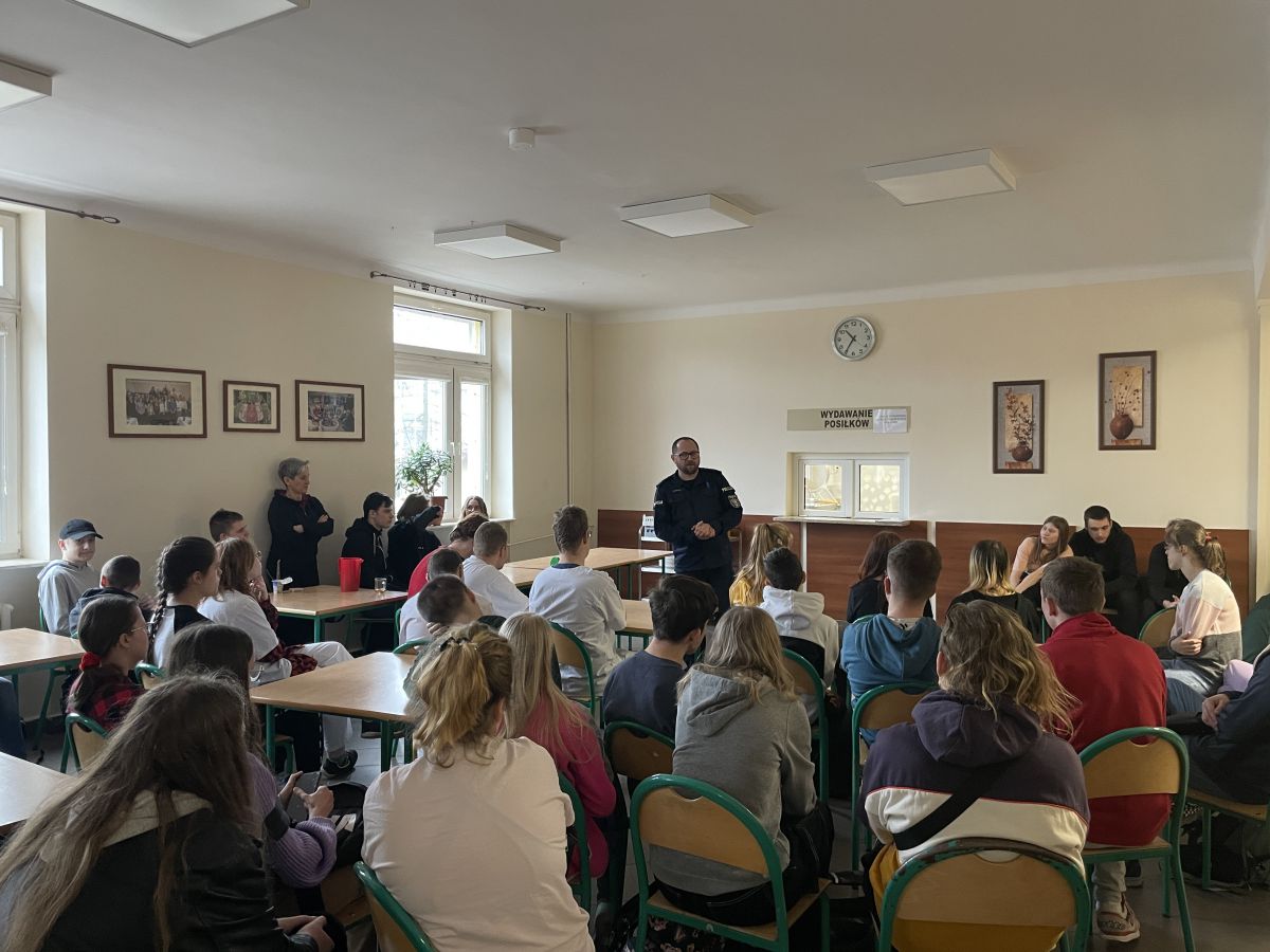 9.03 uczniowie naszej Placówki wzięli udział w spotkaniu z przedstawicielem Policji na temat: Prawne konsekwencje agresji wobec innych. Pan policjant przestrzegał obecnych przed niewłaściwymi zachowaniami i zachęcał do stosowania się obowiązujących norm i regulaminów. Uczniowie z uwagą wysłuchali gościa, a następnie chętnie zadawali pytania dotyczące pracy policjantów.
