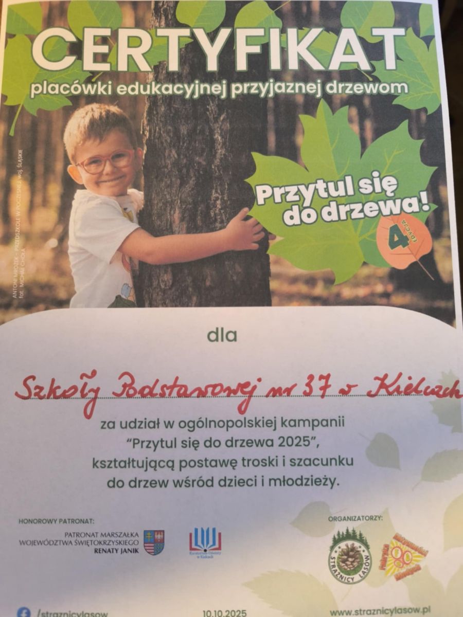 Za udział w akcji otrzymaliśmy Certyfikat placówki edukacyjnej Przyjaznej Drzewom, zaś uczestnicy akcji - indywidualne dyplomy Przyjaciela Drzew. Bardzo się cieszymy.
