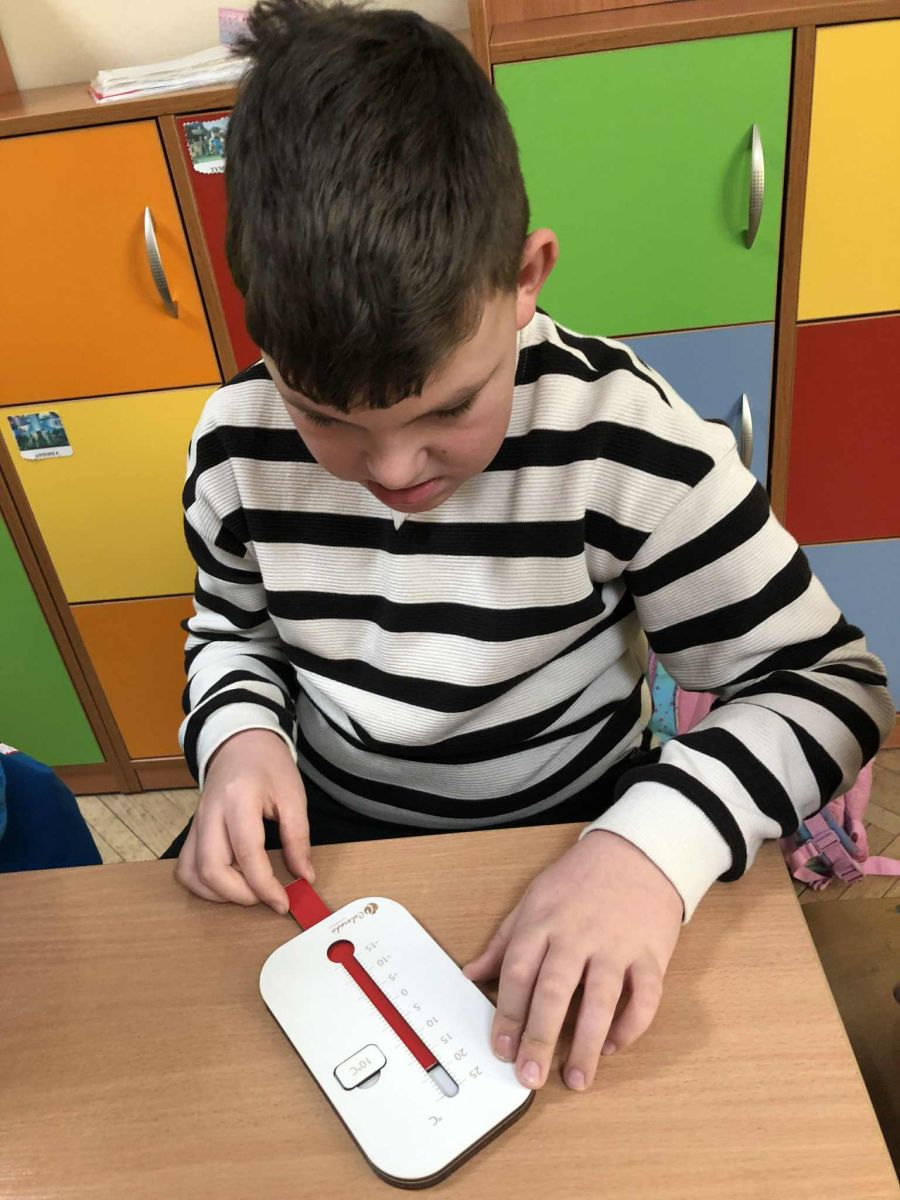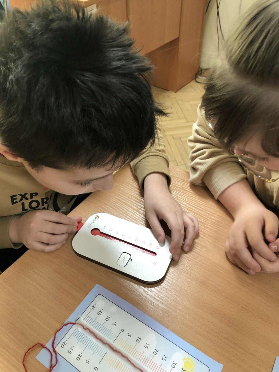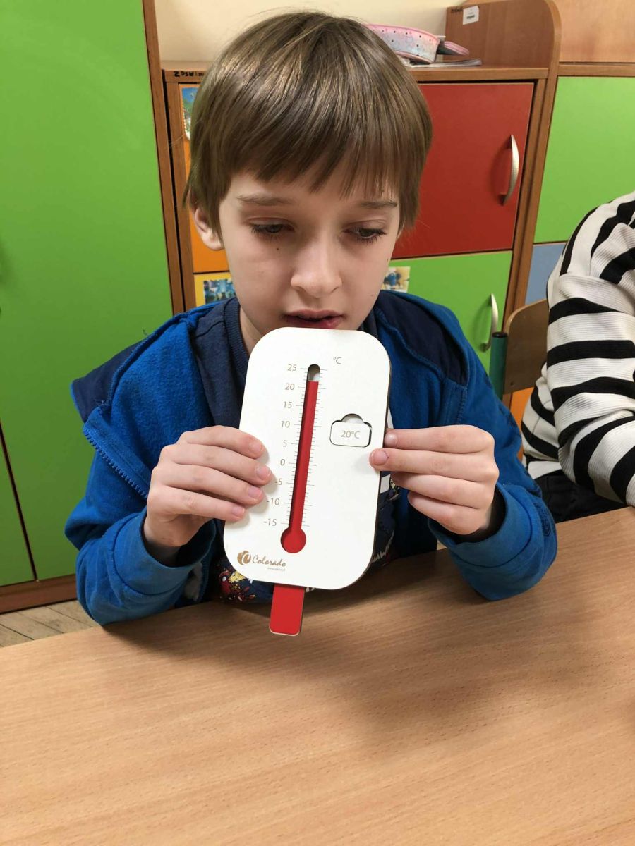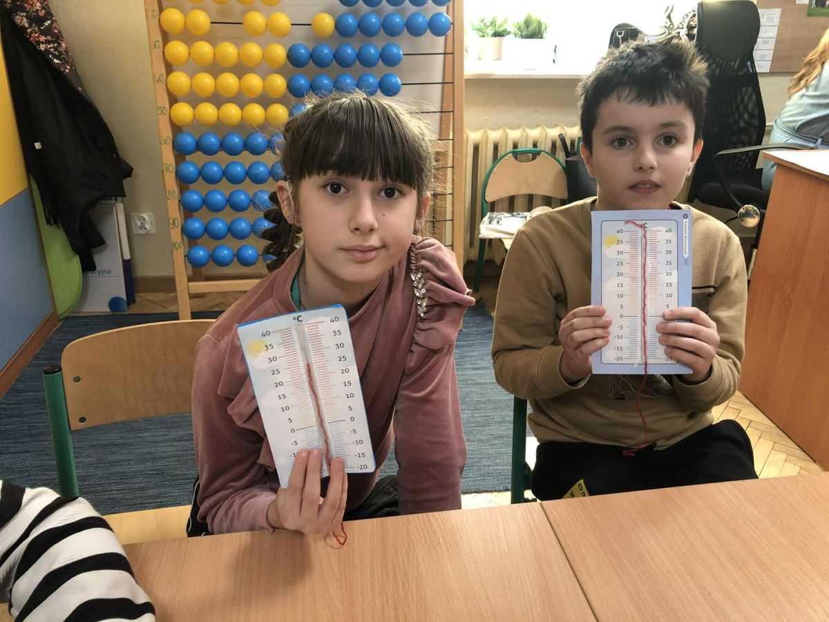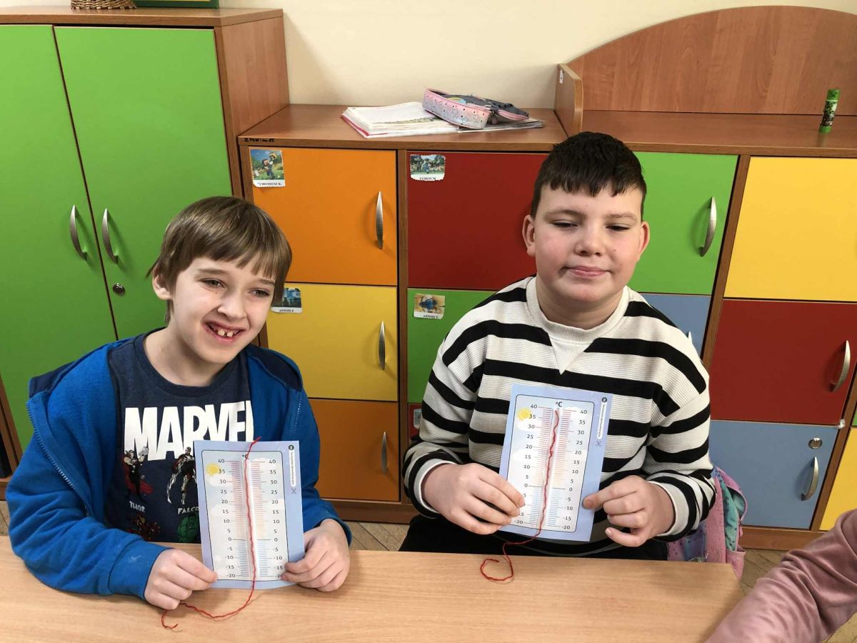 W ramach zajęć innowacji pedagogicznej „Z matematyką na co dzień” uczniowie klasy 1b i 3a zapoznali się z różnymi rodzajami termometrów oraz ich zastosowaniem. W sposób praktyczny ćwiczyli odczytywanie wskazań termometrów oraz porównywali ich wyniki. Przeprowadzali szereg doświadczeń dzięki czemu mogli przekonać się, czy da się sprawdzić temperaturę bez termometru. Zwieńczeniem zajęć było samodzielne wykonanie termometrów.