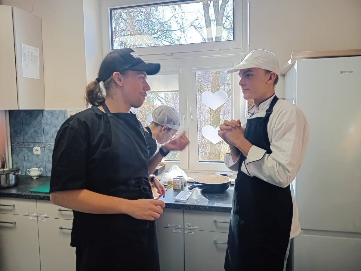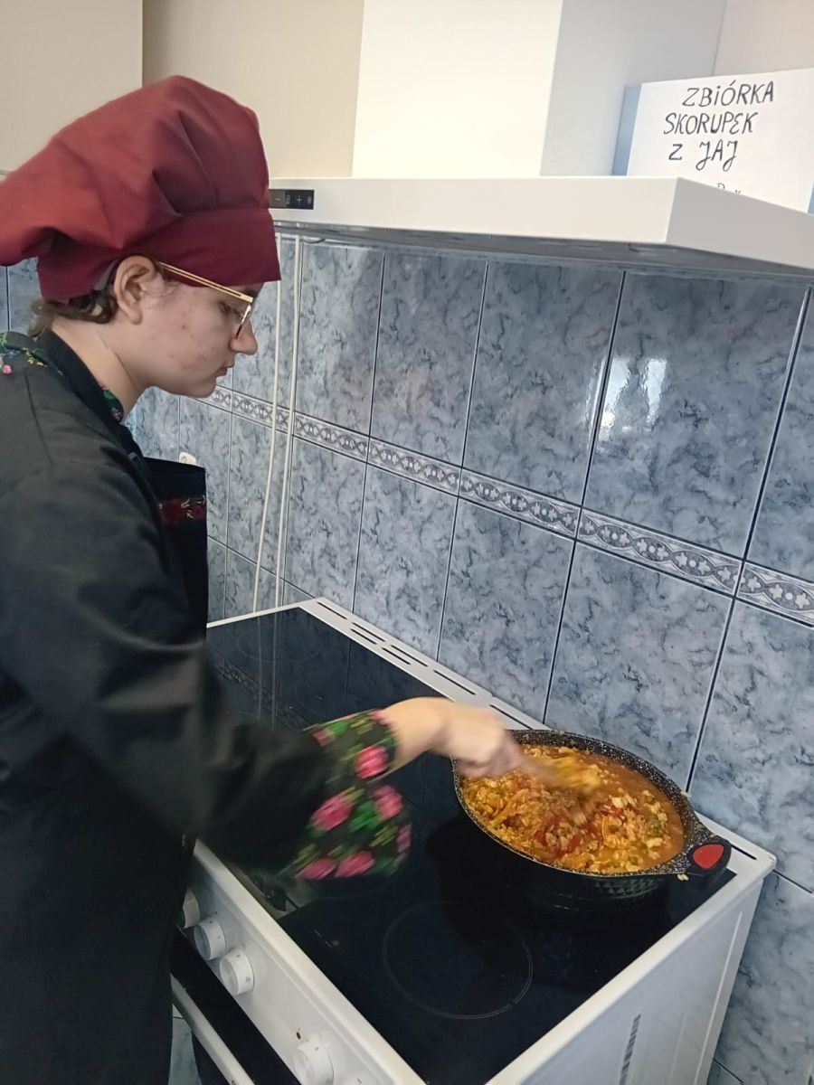 Dnia 6.11 w naszej pracownii gastronomicznej uczniowie, którzy odbyli praktyki w Sewilli, spotkali się ze swoimi młodszymi kolegami z kl. I technikum. Pod okiem nauczyciela przedmiotów zawodowych, pani Bożeny Grabowskiej, uczestnicy mobilności uczyli kolegów, jak zrobić pyszną paellę z kurczakiem. Wykorzystując wiedzę zdobytą podczas praktyk, chętnie dzielili się swoimi umiejętnościami z młodszymi uczniami. Paella wyszła znakomita!